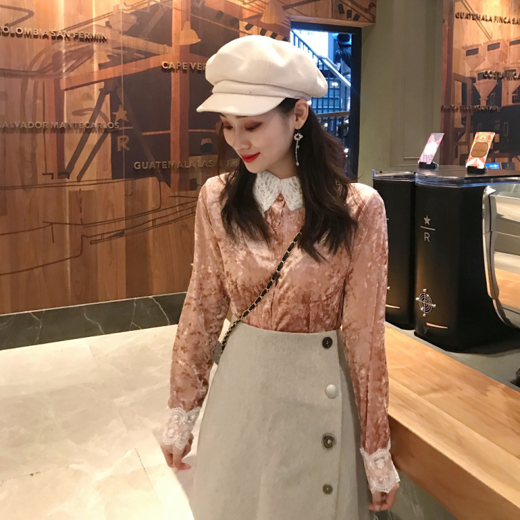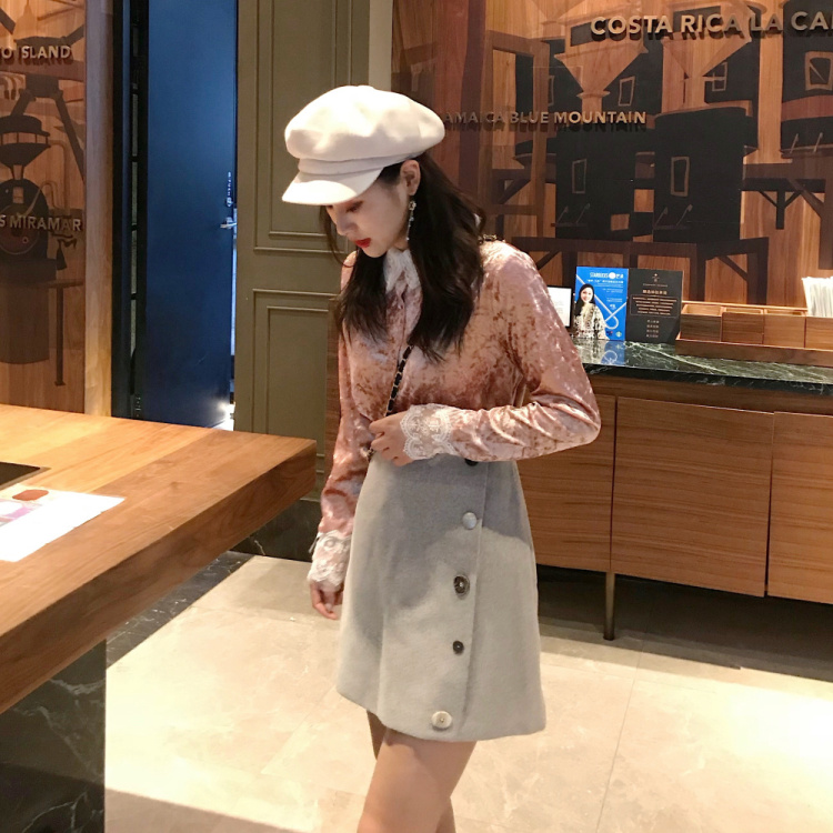 / 韓版金絲絨花邊領襯衫上衣+修身顯瘦排扣短款A字裙高腰半身裙套裝