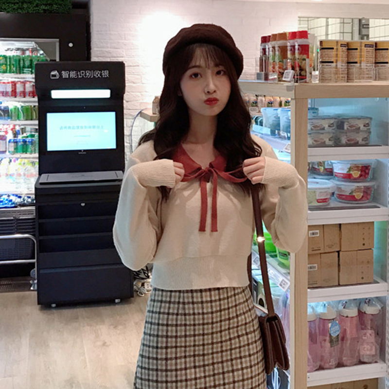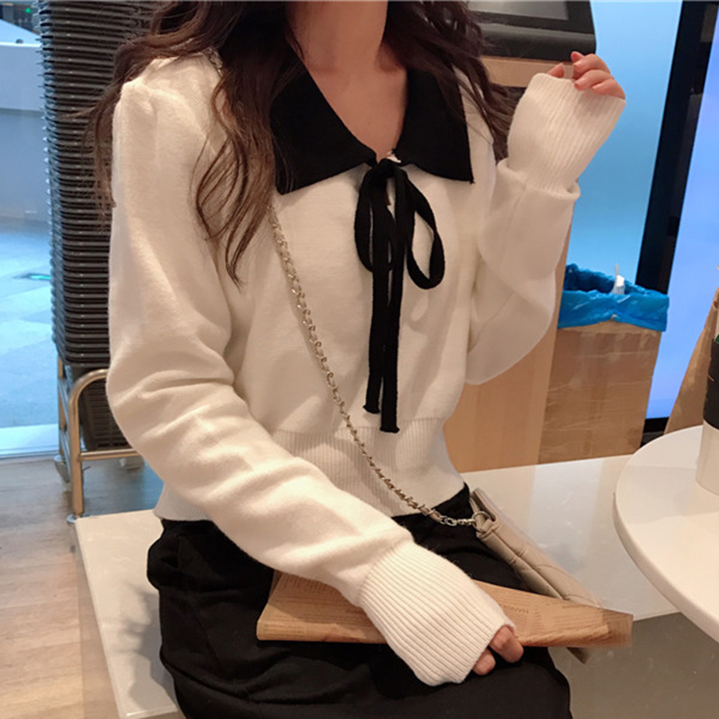 / 甜美學院風短款針織衫秋裝2018新款少女時尚拼色系帶長袖打底上衣