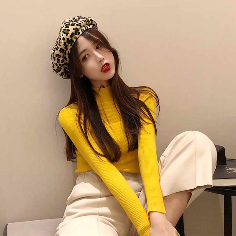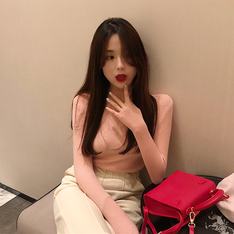 糖果色緊身打底衫秋冬女裝2018新款韓版修身半高領長袖針織上衣女