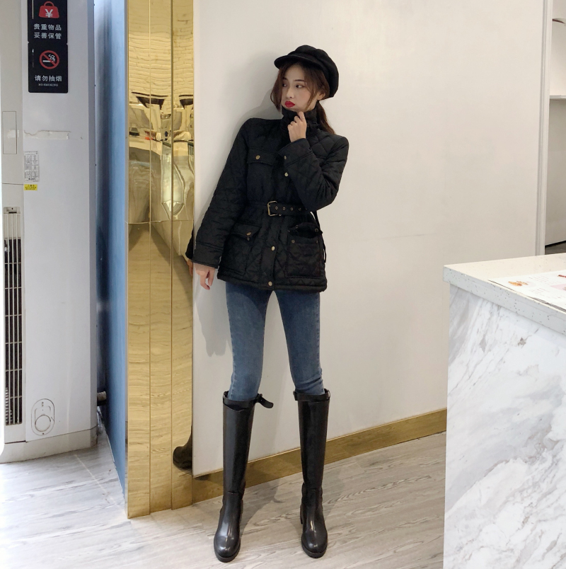 時尚chic外套女秋冬2018新款韓版百搭潮流短款夾克棉服外套配腰帶