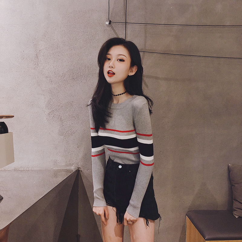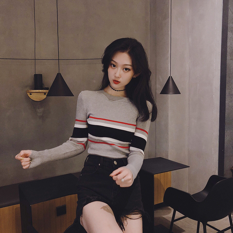 / 韓版時尚秋裝女2018新款chic上衣套頭長袖修身條紋打底針織衫毛衣