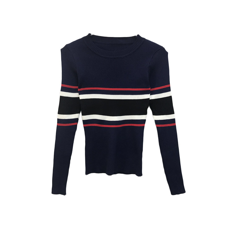 時尚秋裝女2018新款氣質百搭韓版拼色彩條圓領顯瘦針織衫打底衫潮