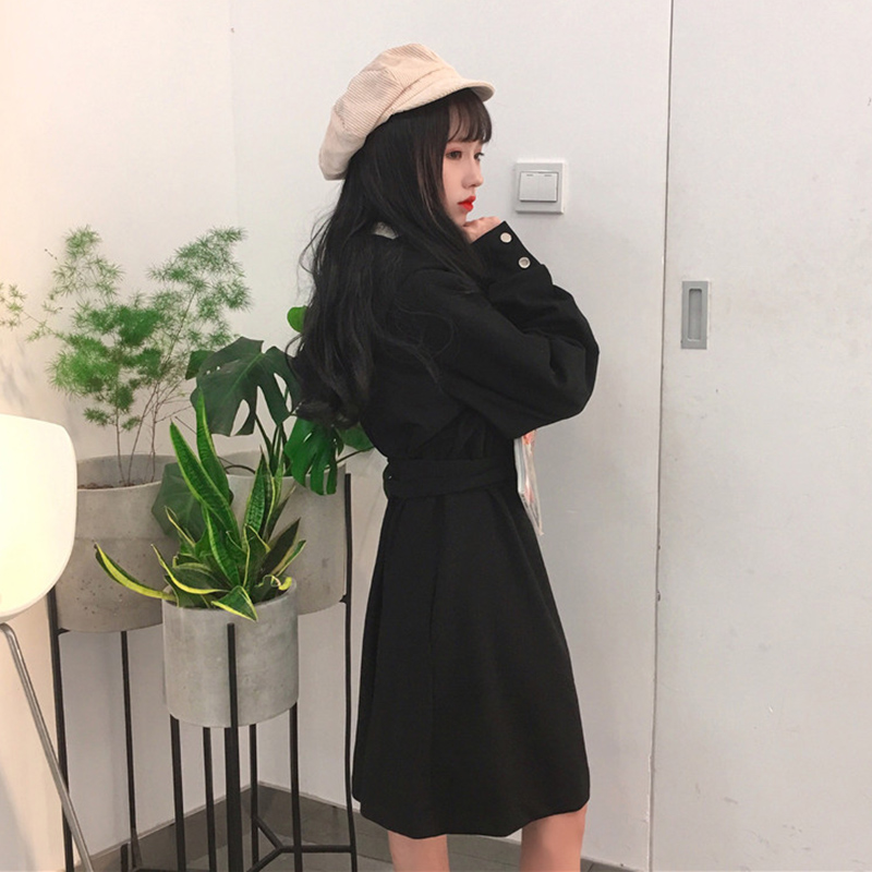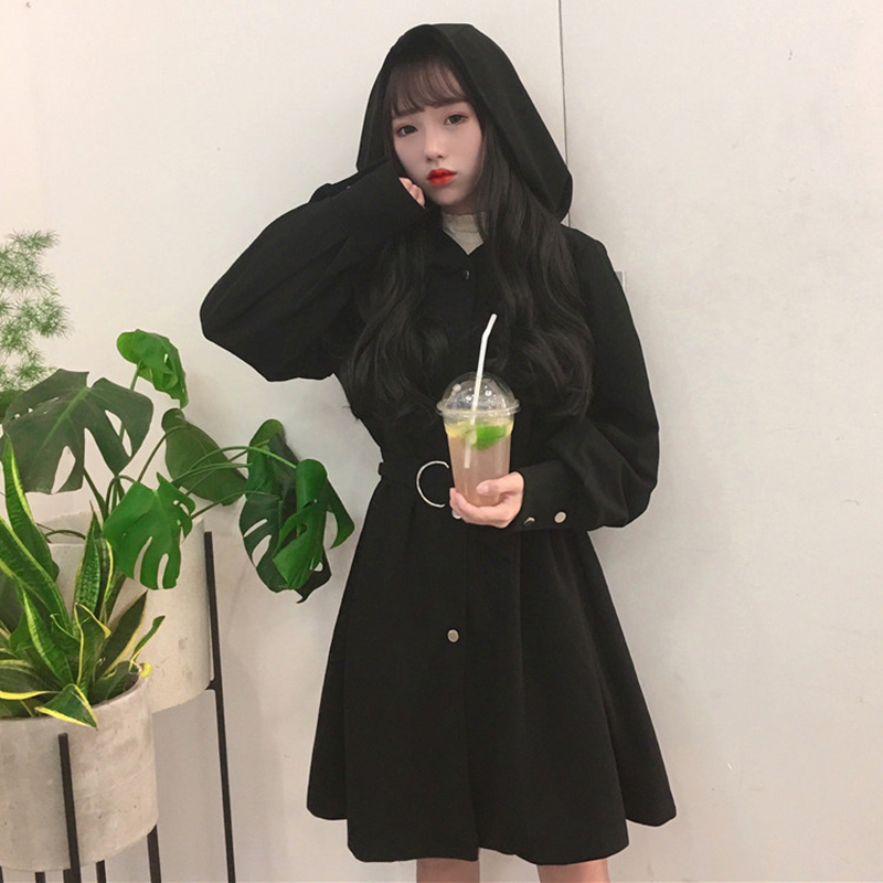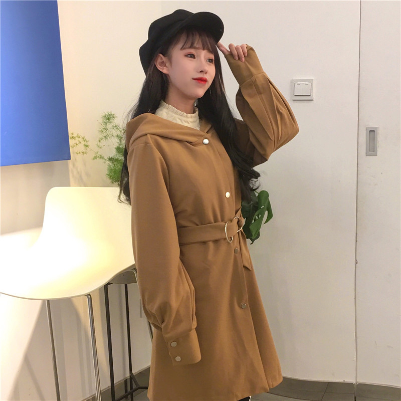 / 休閑連帽風衣外套開衫秋裝女2018新款韓版寬松收腰黑色中長款上衣