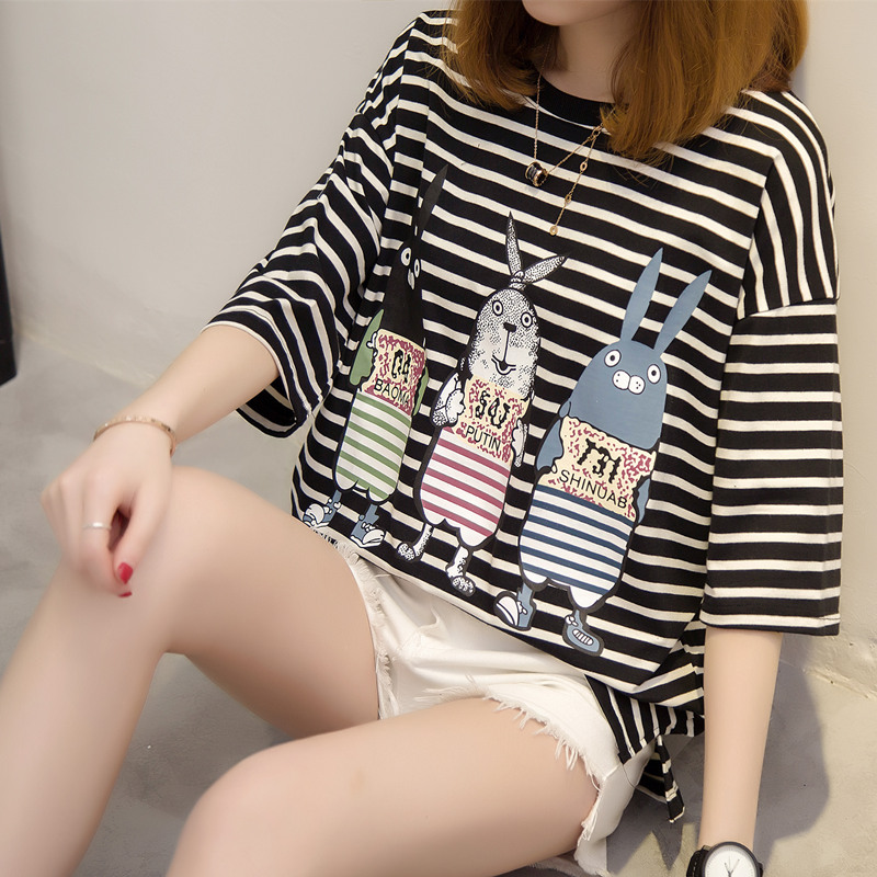/ 夏季短袖女上衣學生韓國寬松bf風條紋t恤女小清新新款潮衣服