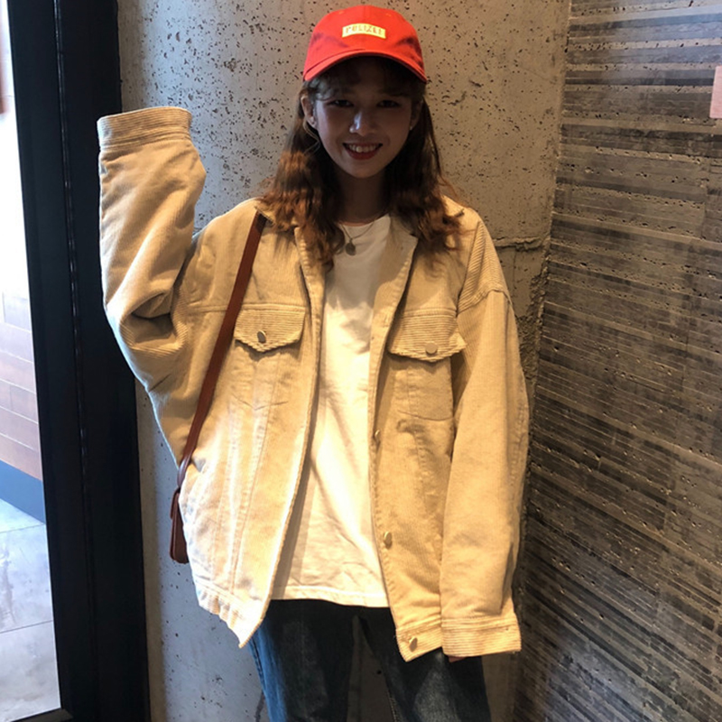原宿風燈芯絨外套女秋冬裝2018新款韓版學生寬松翻領長袖開衫上衣