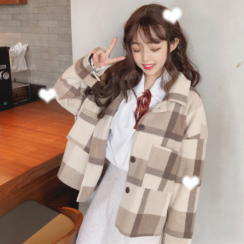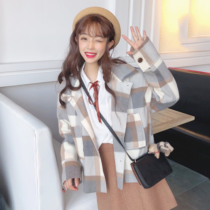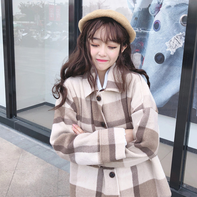 / 2018流行呢子大衣女秋冬裝新款韓版學生寬松格子翻領雙面毛呢外套