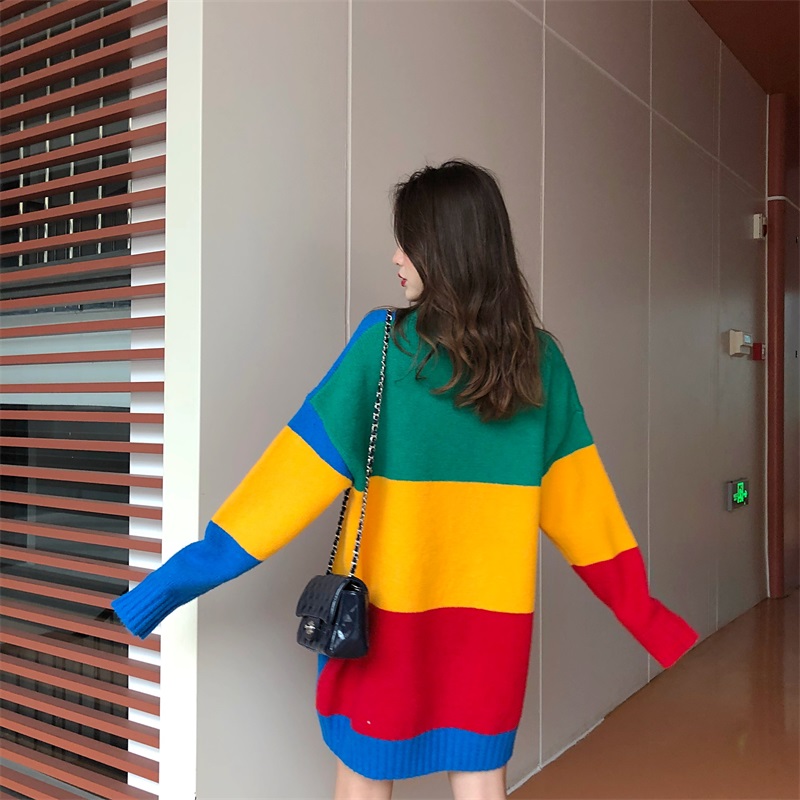 韓版百搭慵懶風毛衣女2018新款寬松oversize條紋中長款毛線上衣潮