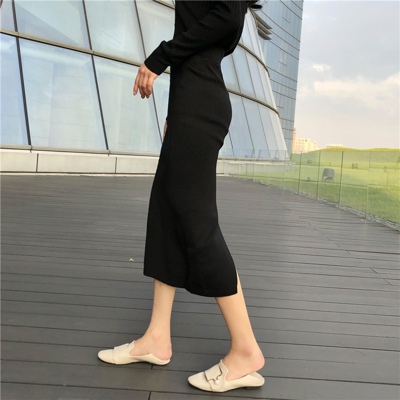 / 裙子女新款韓版chic秋天港味溫柔復古高腰開叉修身針織百搭半身裙
