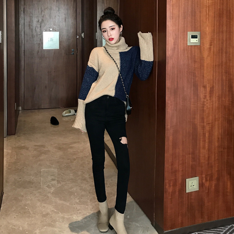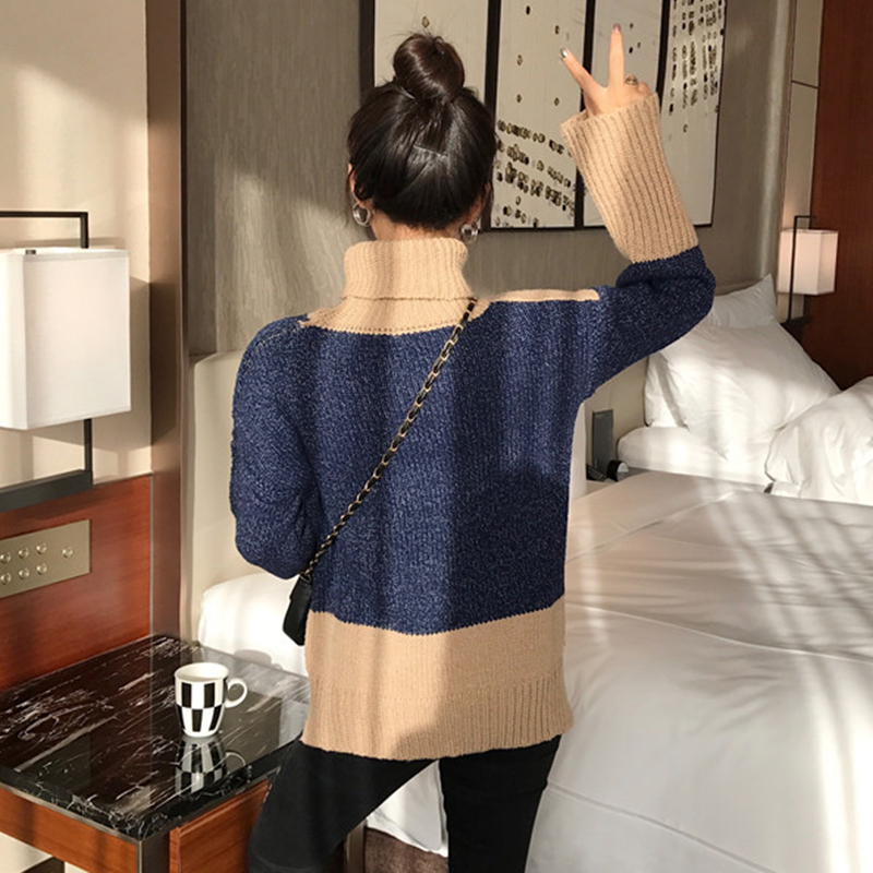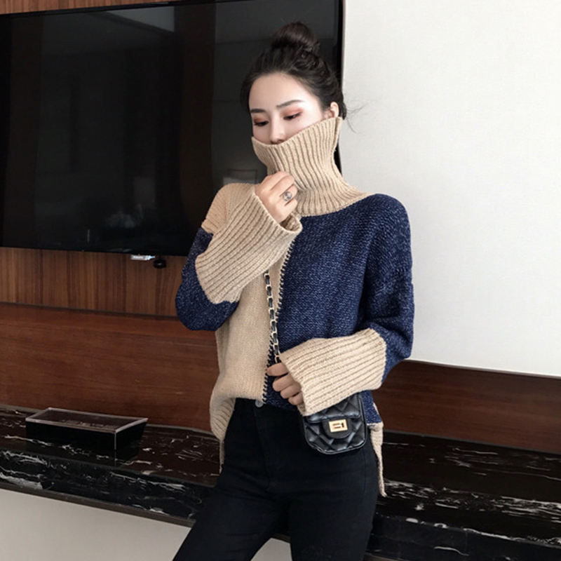 韓版高領拼色毛衣外套女冬裝2018新款chic氣質寬松長袖套頭針織衫