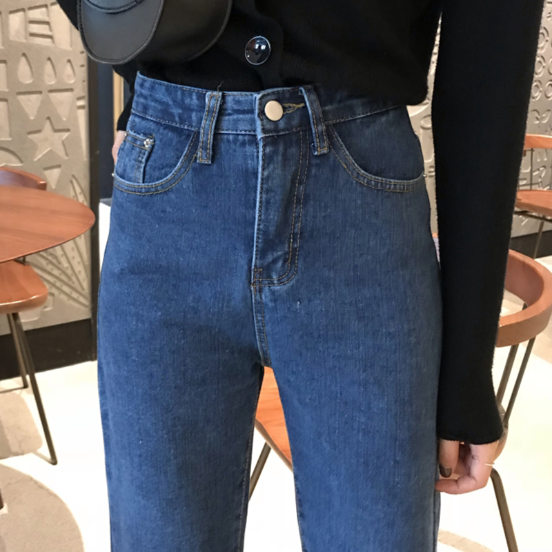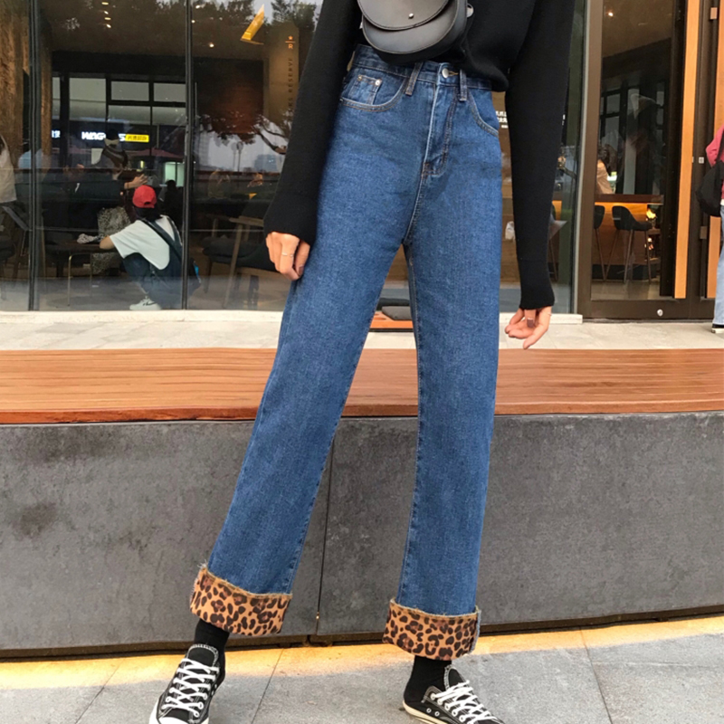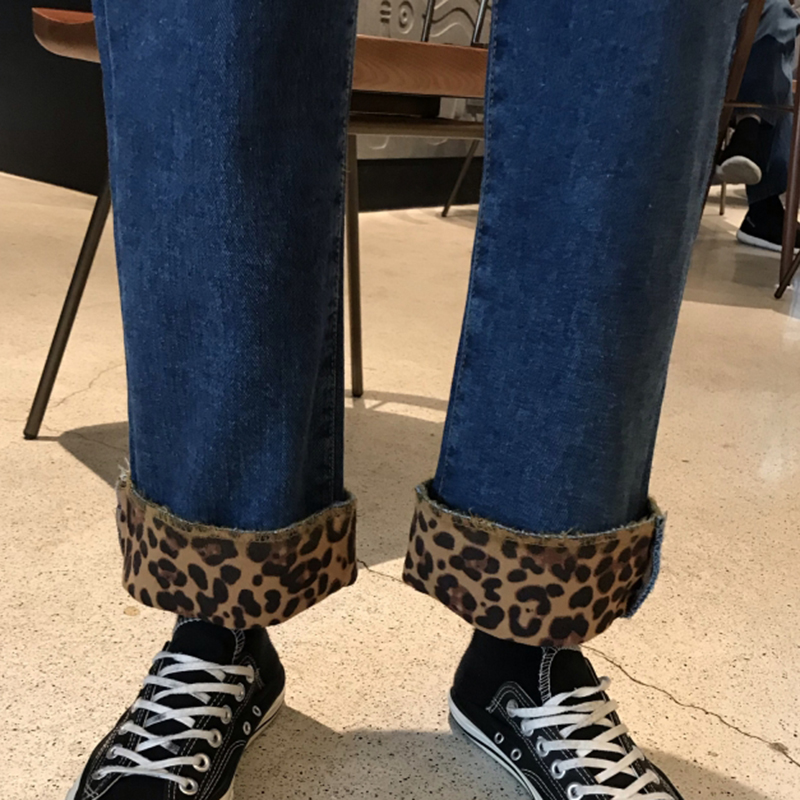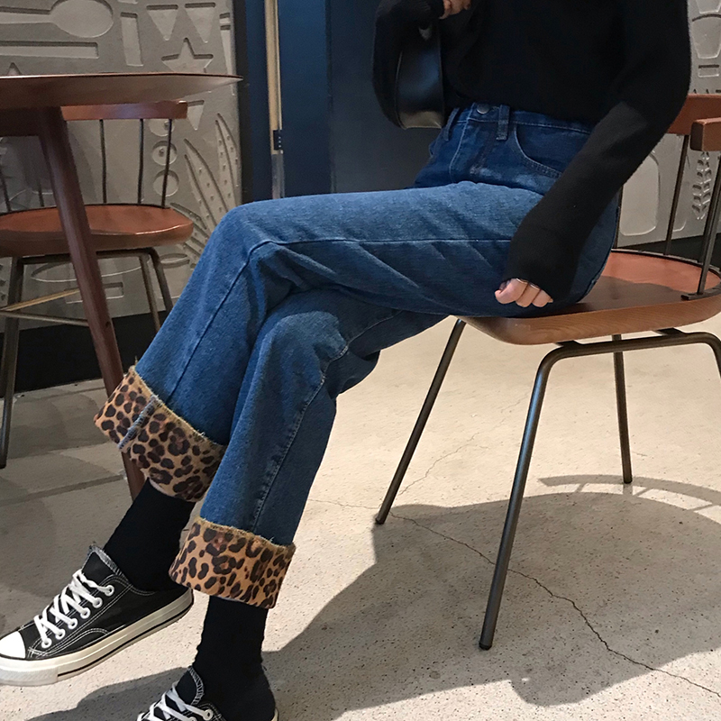 冬季女裝2018新款高腰顯瘦加絨直筒牛仔褲復古風豹紋闊腿九分褲子
