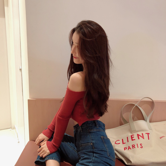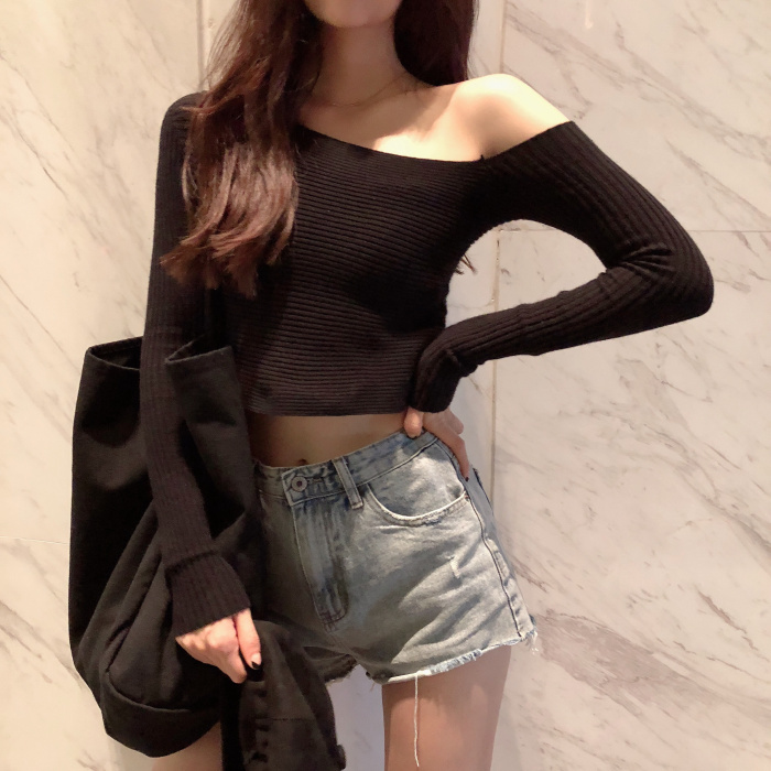 / 韓版時尚秋裝女2018新款百搭露斜肩漏鎖骨針織衫短款小心機上衣潮