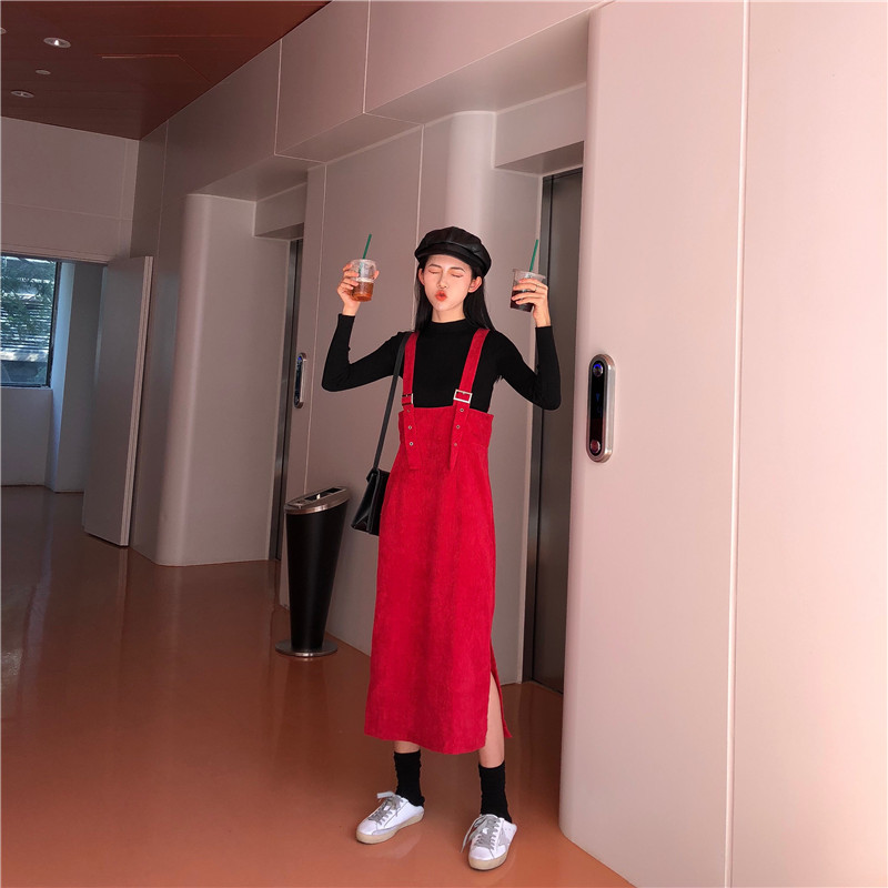 學院風基礎修身長袖百搭針織打底衫+復古純色開叉燈芯絨背帶裙子