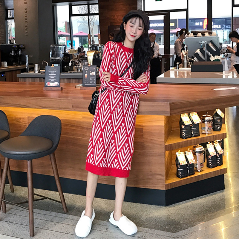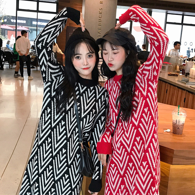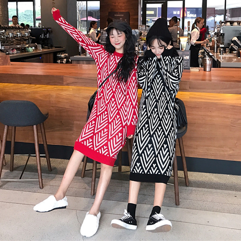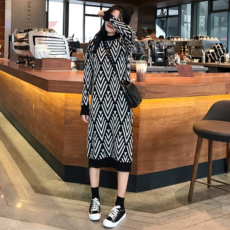 中長款寬松顯瘦菱形套頭連衣裙女秋冬裝2018新款韓版長袖毛衣裙子