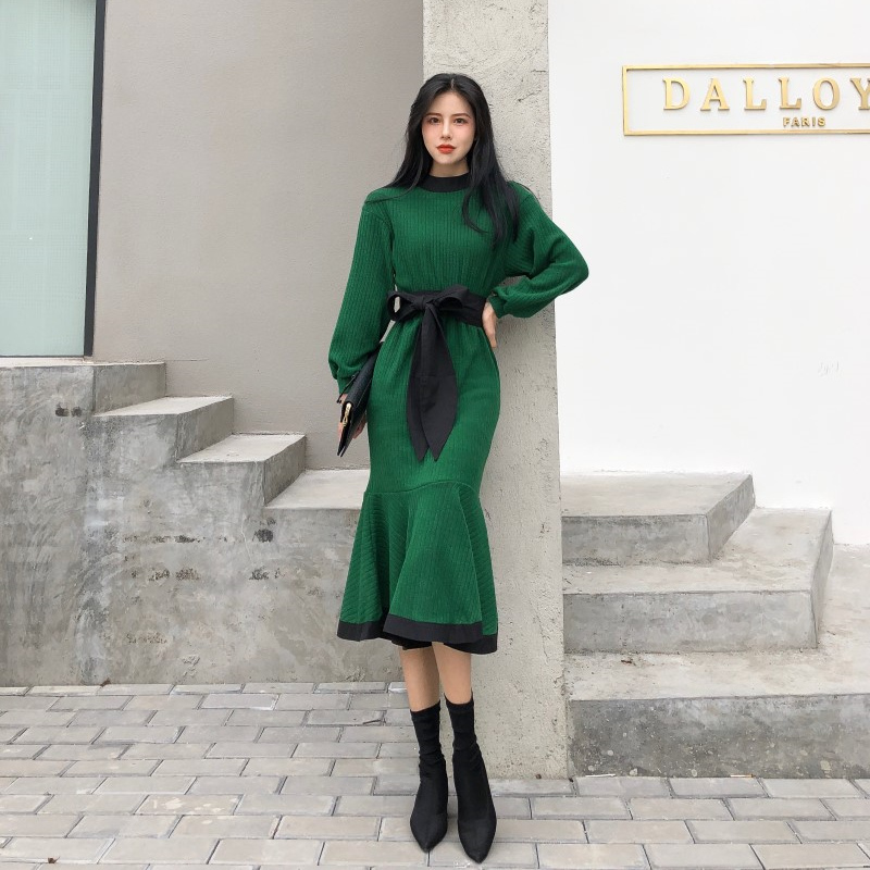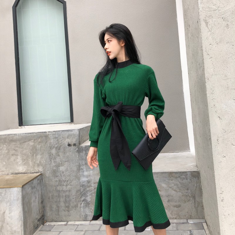 晚晚風新款韓版女時尚氣質百搭顯瘦中長款打底魚尾裙連衣裙配腰帶