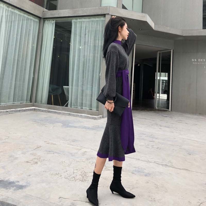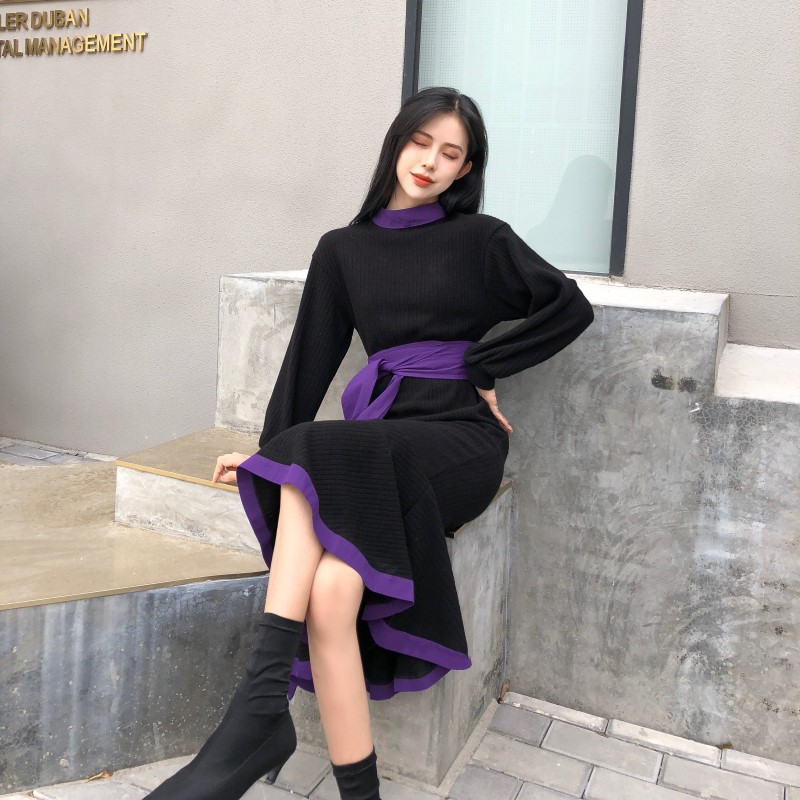 / 晚晚風新款韓版女時尚氣質百搭顯瘦中長款打底魚尾裙連衣裙配腰帶