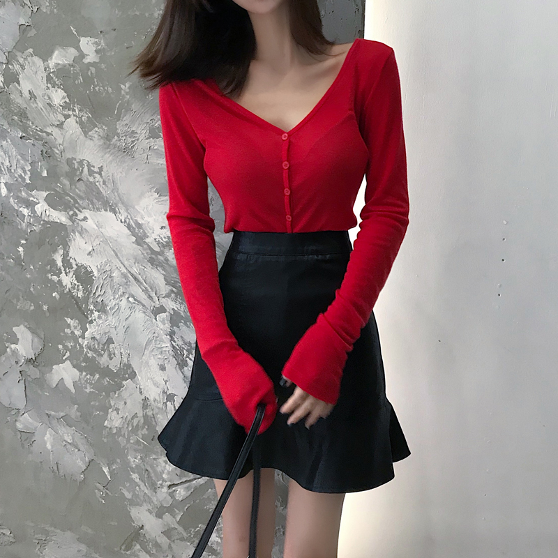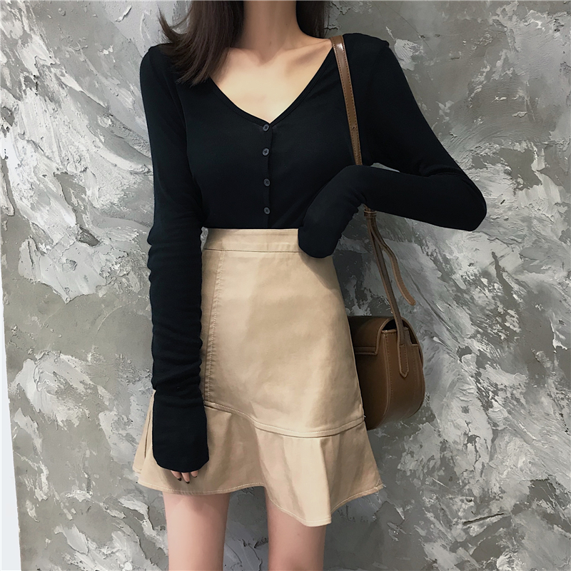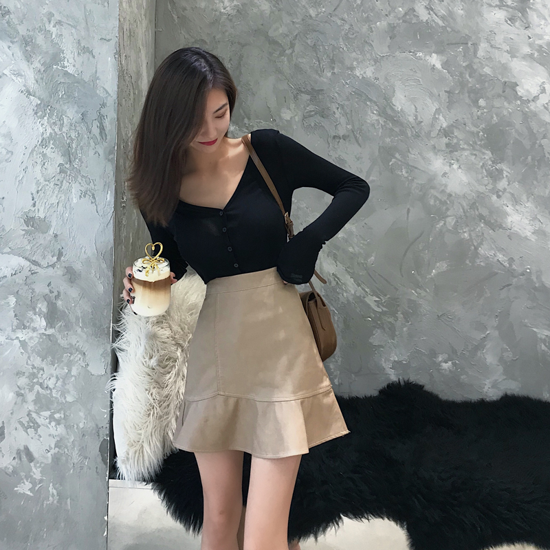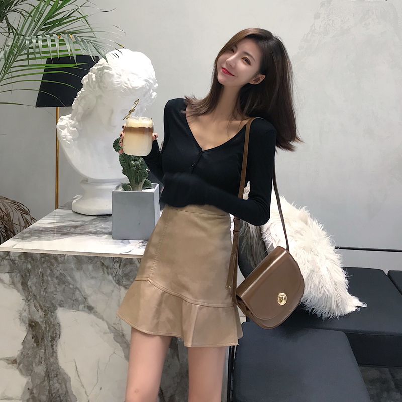 / 2018時尚顯瘦荷葉邊PU皮短裙彈力修身V領單排扣打底衫氣質套裝女