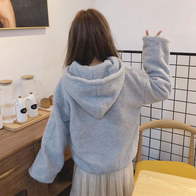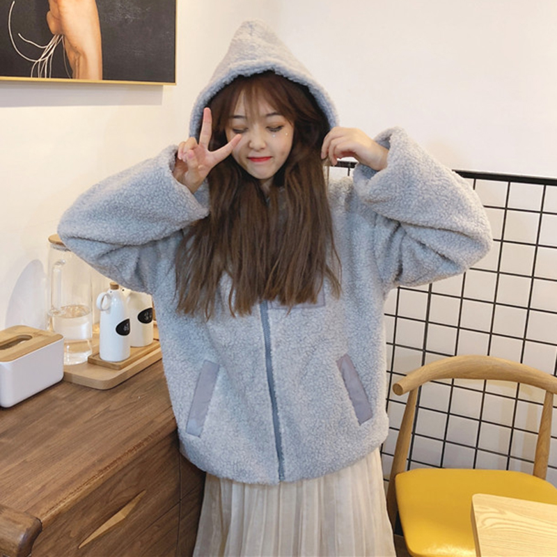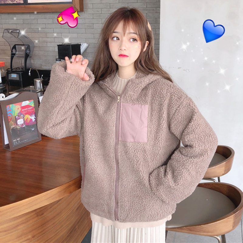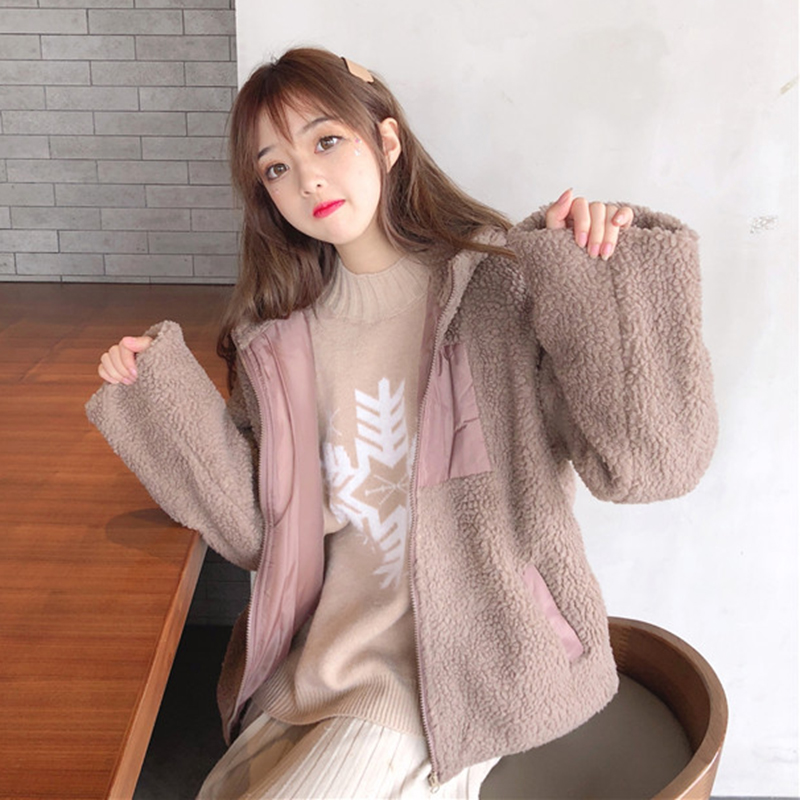學院風仿羊羔毛外套女秋冬裝2018新款韓版時尚寬松拼色連帽上衣潮
