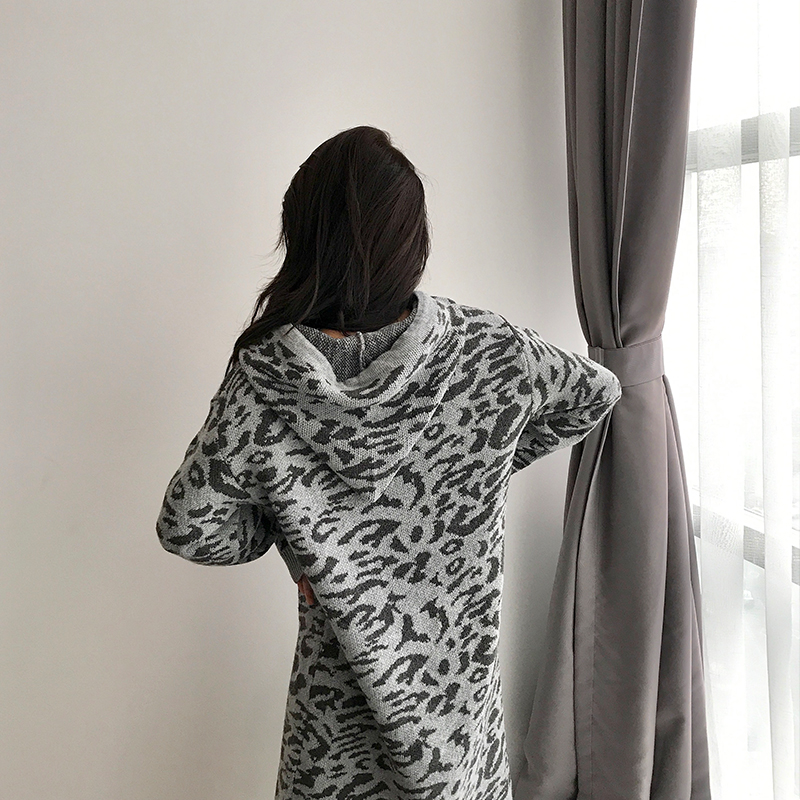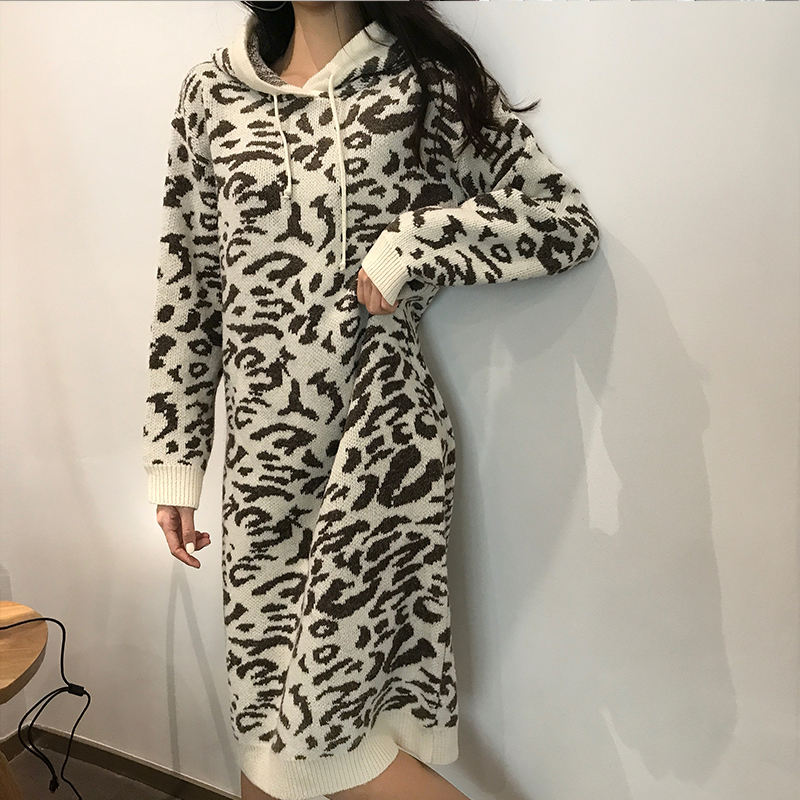 晚晚風秋冬新款韓版長袖連帽中長裙豹紋氣質時尚chic顯瘦連衣裙女