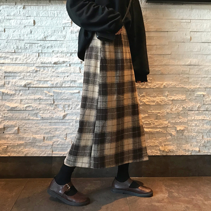 秋冬新款呢子半身裙港味復古格子a字中長裙女裝一片式高腰包臀裙