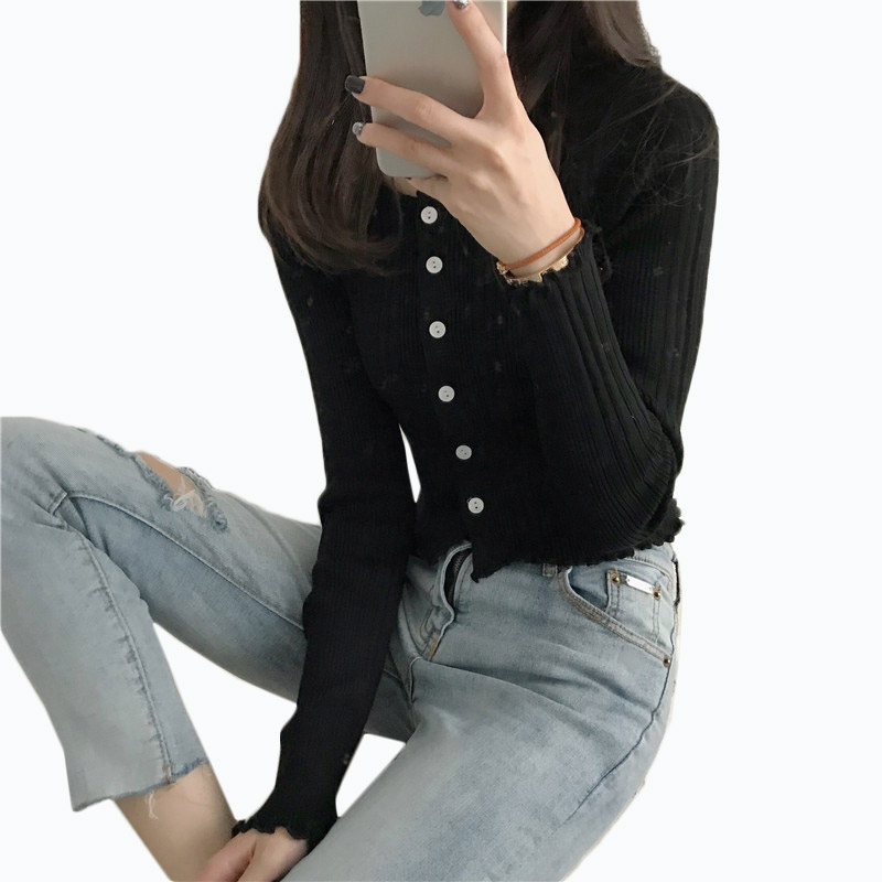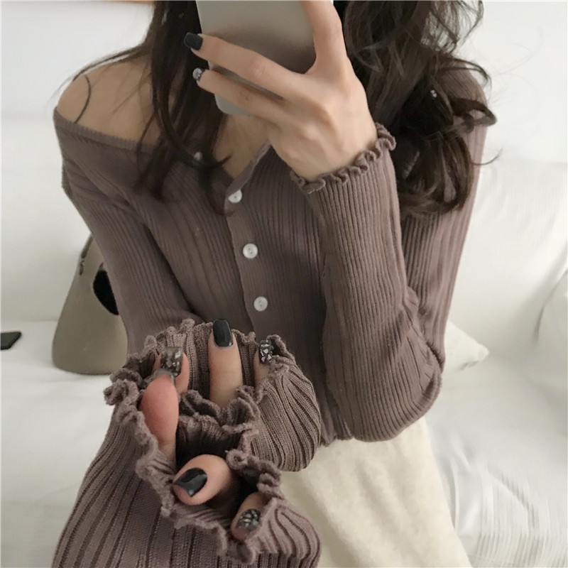 韓版chic早秋慵懶溫柔毛衣坑條V領一排扣喇叭袖純色百搭針織開衫