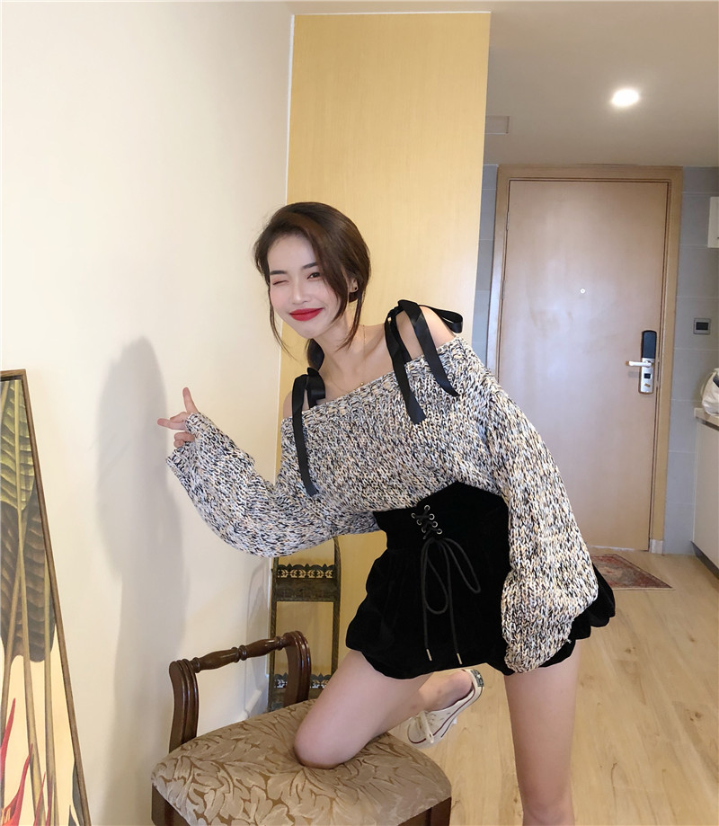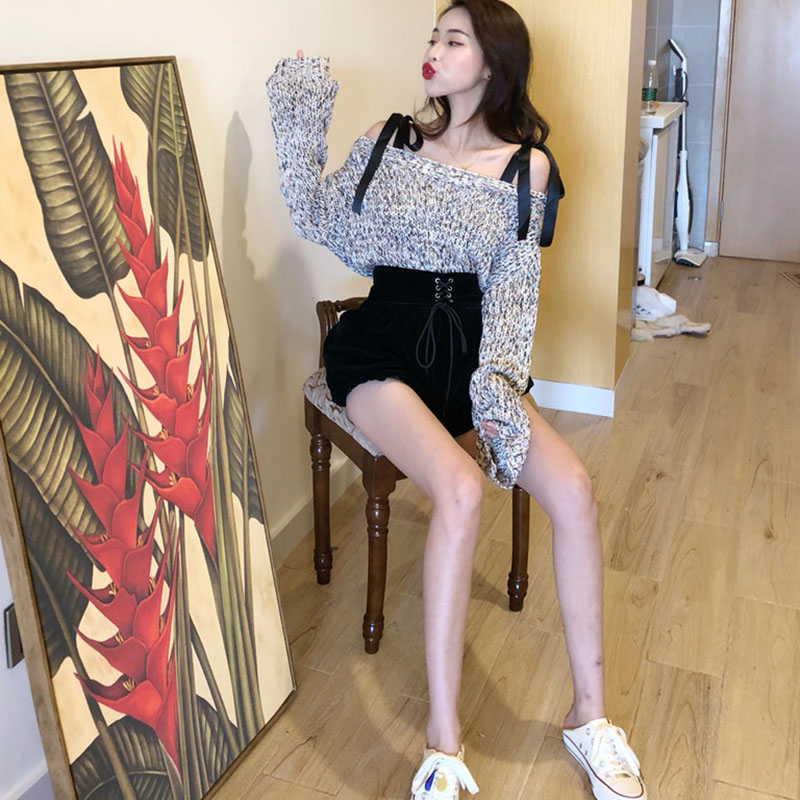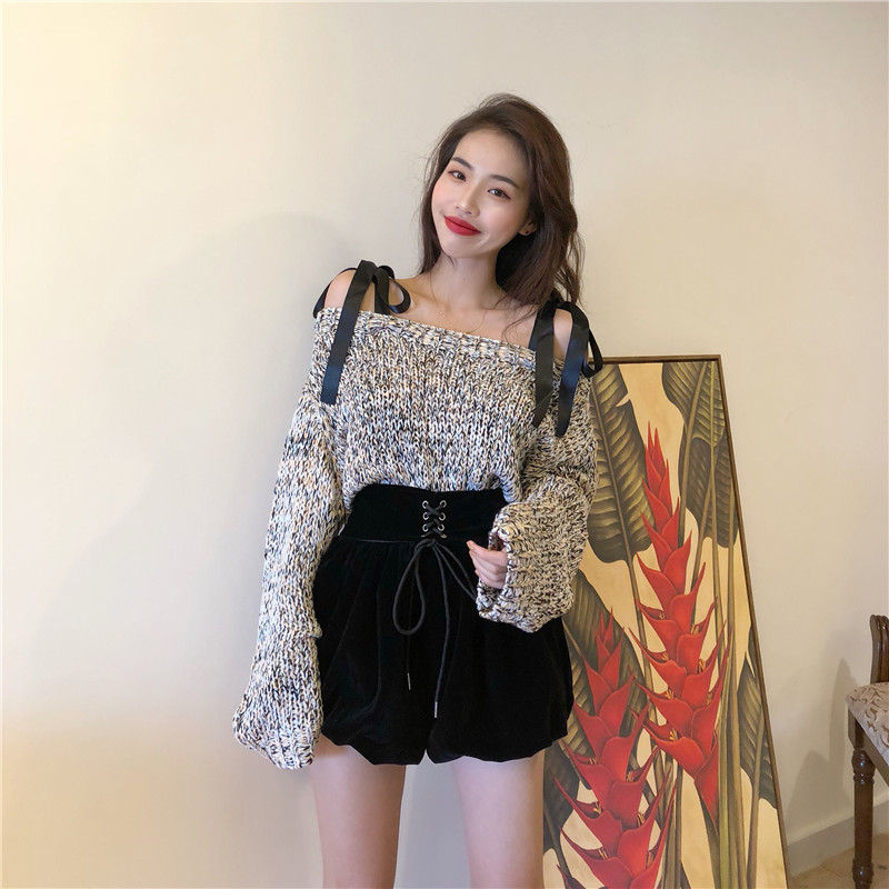 韓系時尚網紅毛衣女2018新款寬松慵懶風百搭毛絨絨掛脖露肩上衣潮