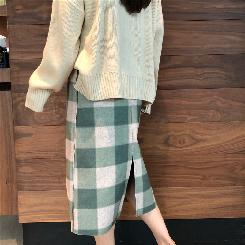 港味復古毛呢格子半身裙女秋冬裝2018新款顯瘦氣質開叉高腰包臀裙