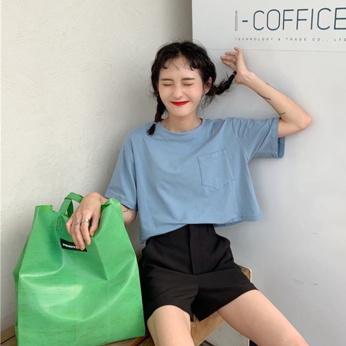 馨幫幫 糖果色口袋T恤~短款/中長款閨蜜裝港味小清新牛油果綠上衣