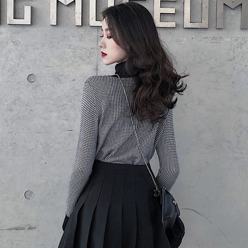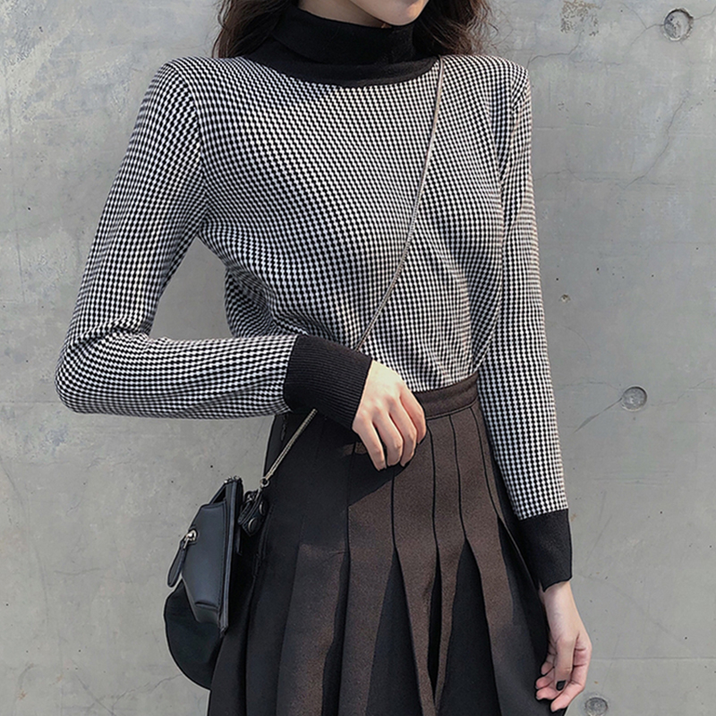 chic港味拼接高領格子針織衫女秋冬裝2018新款韓版短款打底薄毛衣