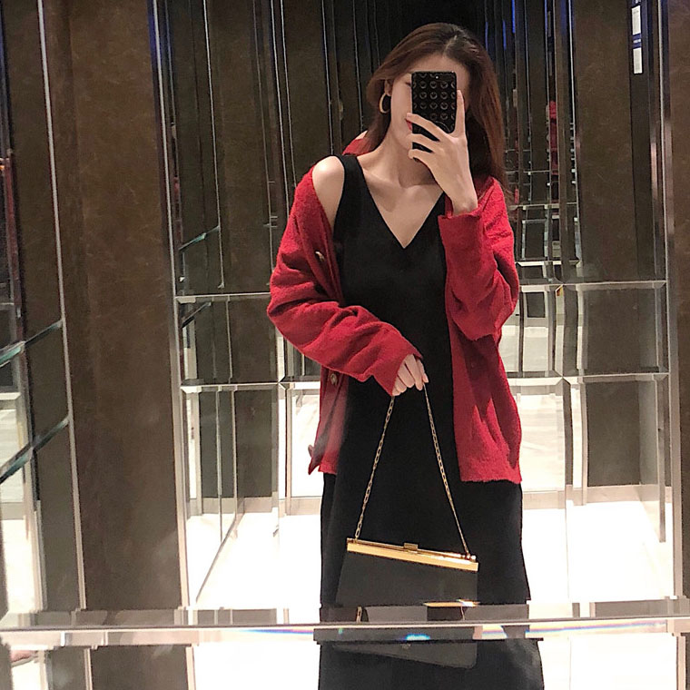 馬海毛網紅毛衣女2018新款針織開衫外套冷淡風針織吊帶連衣裙套裝