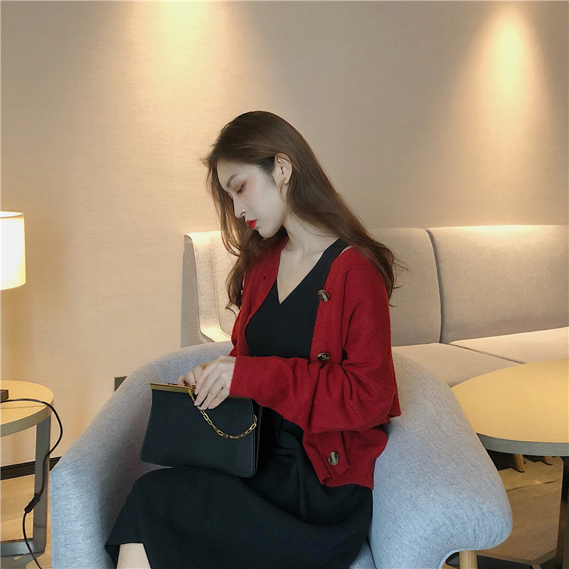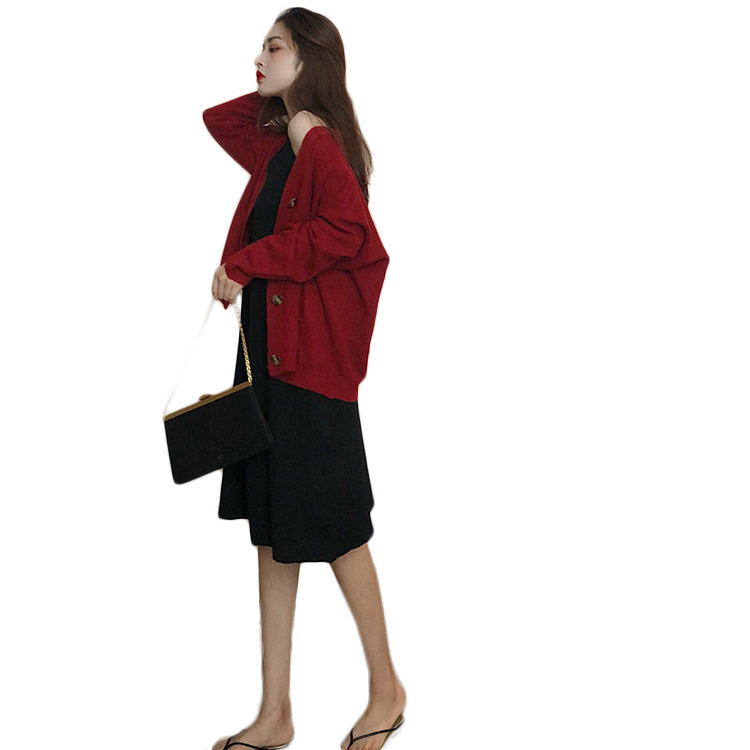 秋裝女2018新款套裝V領針織吊帶連衣裙+慵懶純色毛衣針織開衫外套