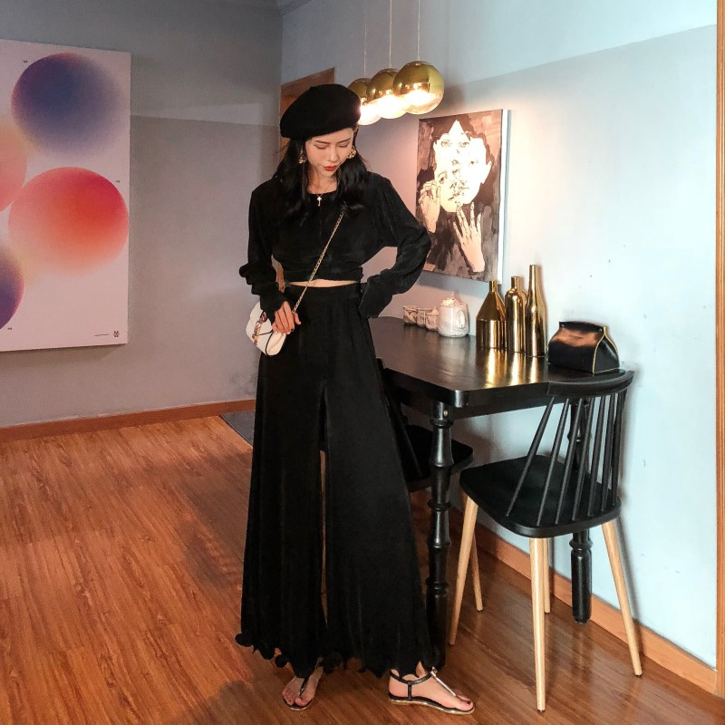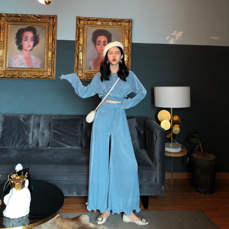 / 秋裝新款百搭長袖短款系帶上衣高腰闊腿長褲兩件套港風時尚套裝女