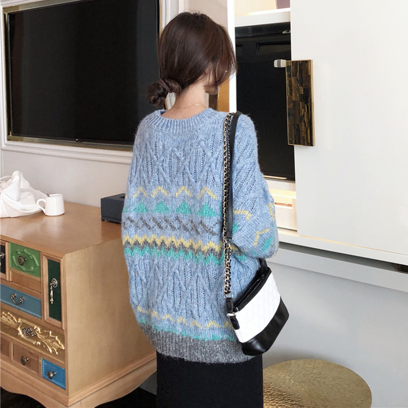 慵懶風麻花套頭針織衫女秋冬裝2018新款韓版時尚寬松拼色毛衣外套