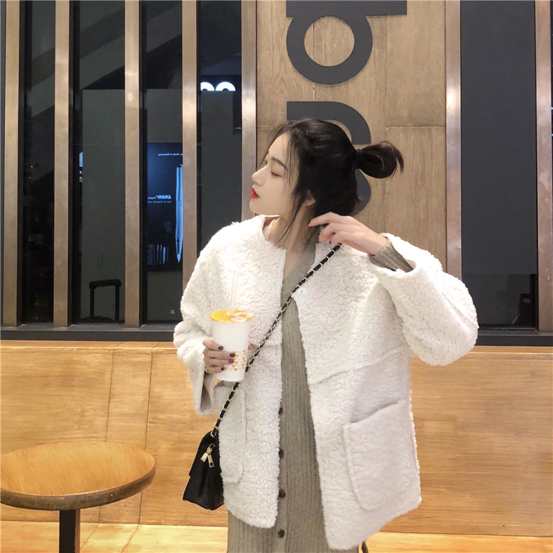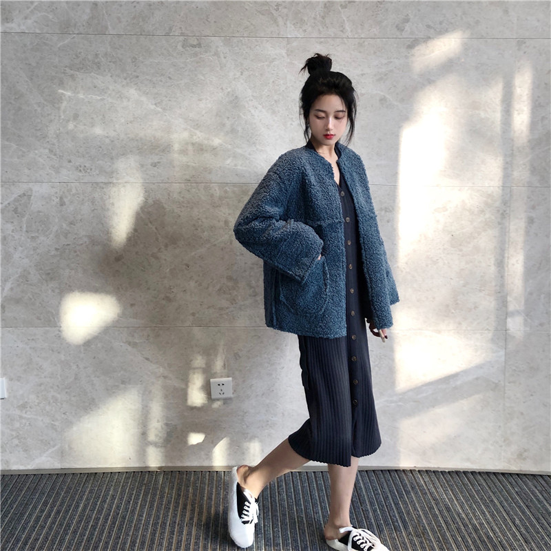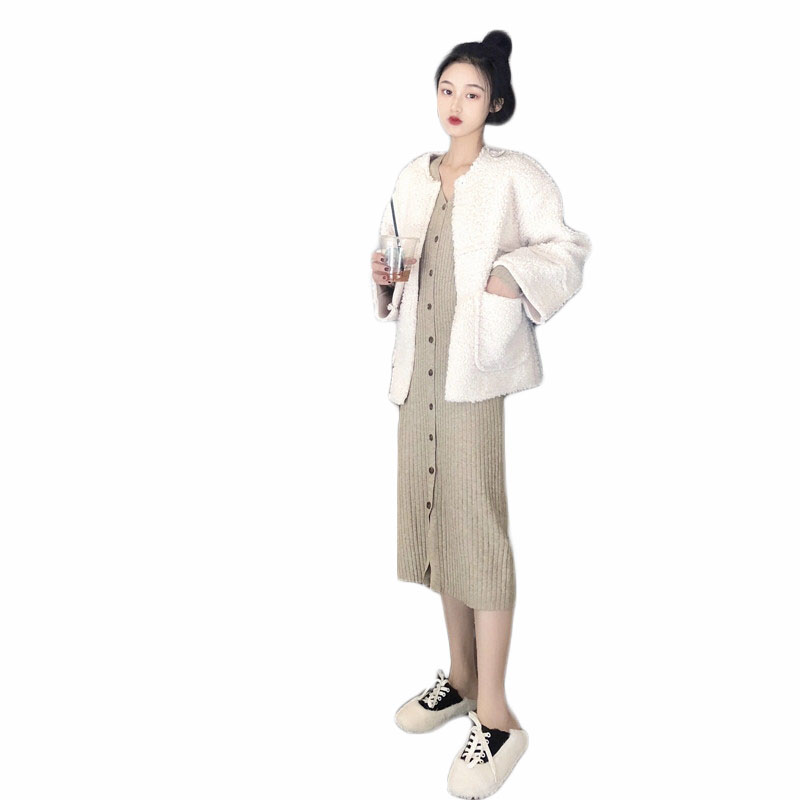 韓國復古風女神套裝秋冬新款修身坑條長袖針織連衣裙+羊羔毛外套