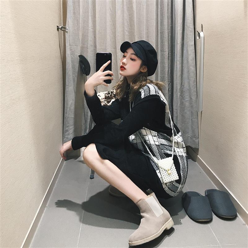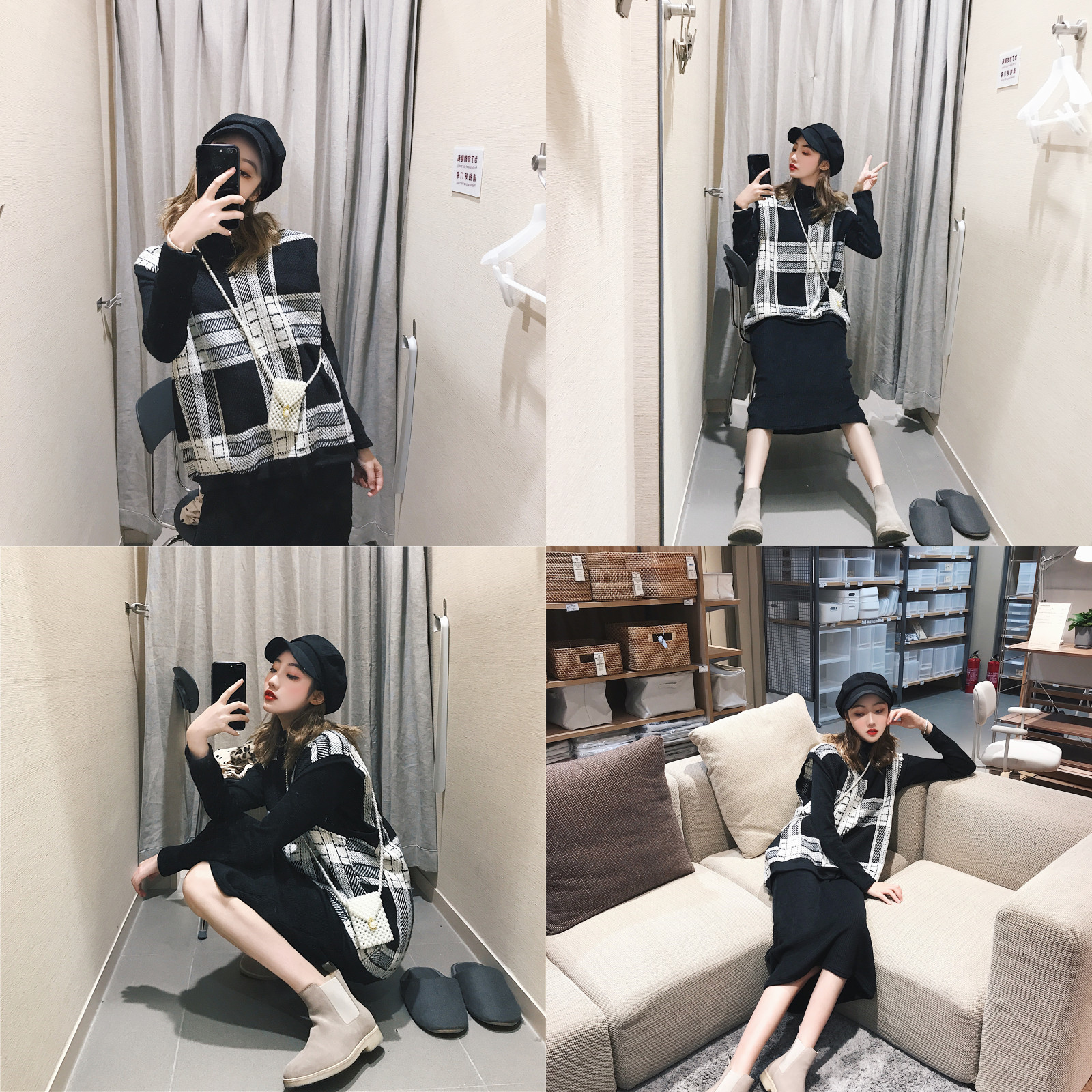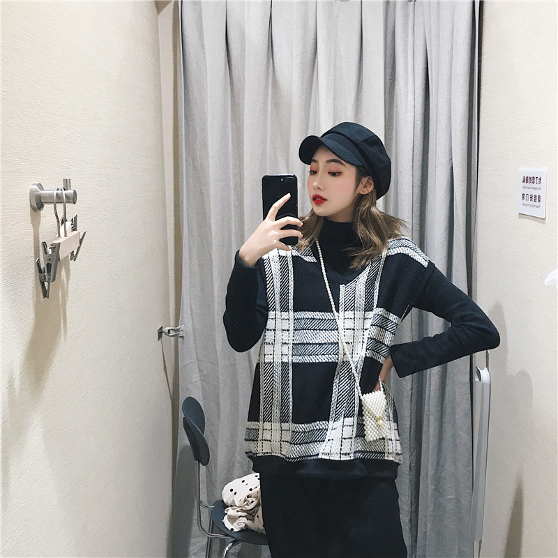 / 新款秋冬粗花呢V領寬松背心馬甲時尚套裝高領長袖打底裙兩件套潮