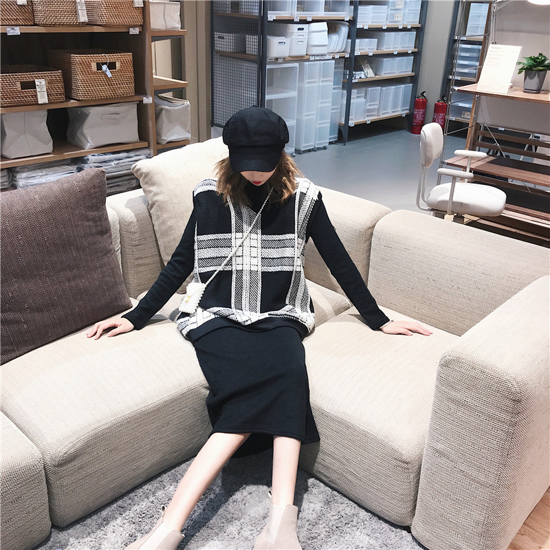 新款秋冬粗花呢V領寬松背心馬甲時尚套裝高領長袖打底裙兩件套潮