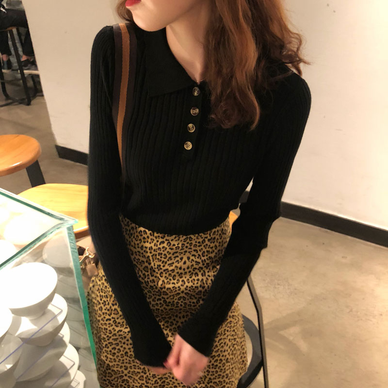 chic秋季百搭韓國新款打底衫純色氣質時尚復古排扣翻領針織上衣女