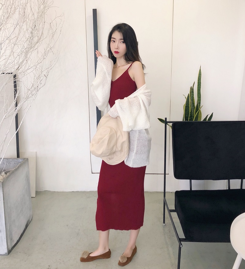 白色開衫|酒紅吊帶裙|黑色吊帶裙|灰色開衫