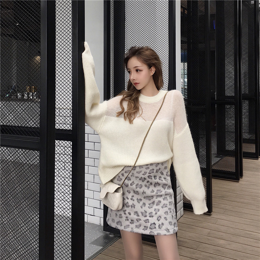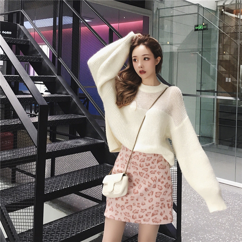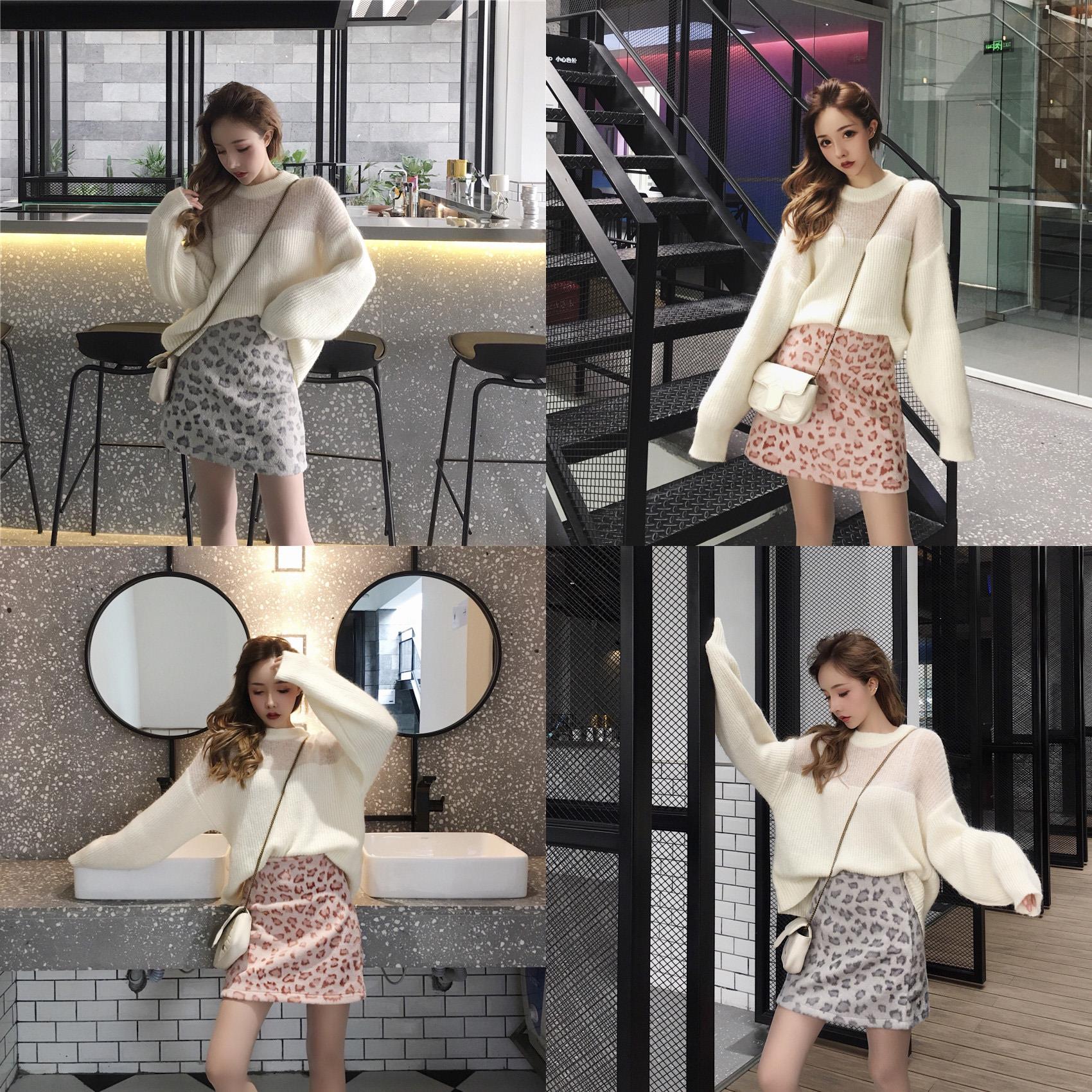 / 新款拼接燈籠袖毛衣毛呢豹紋半身裙A字裙子兩件套港風時尚套裝女