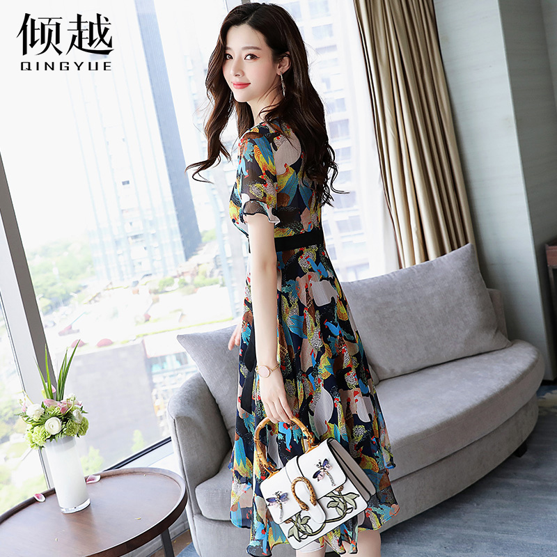 氣質名媛V領荷葉邊收腰中長款喇叭袖碎花雪紡連衣裙女2017夏新款