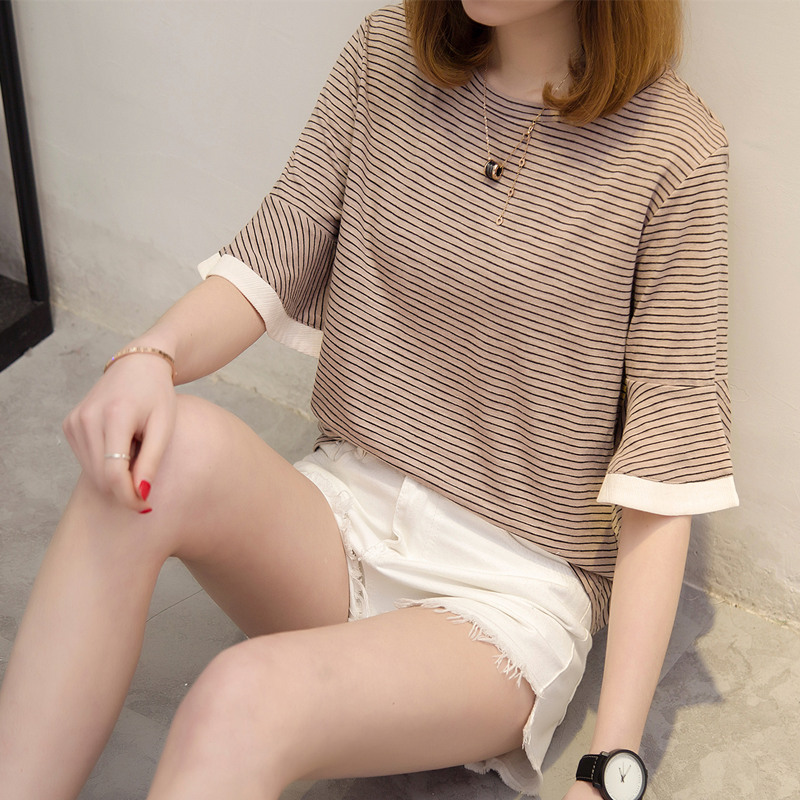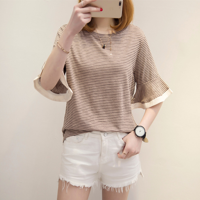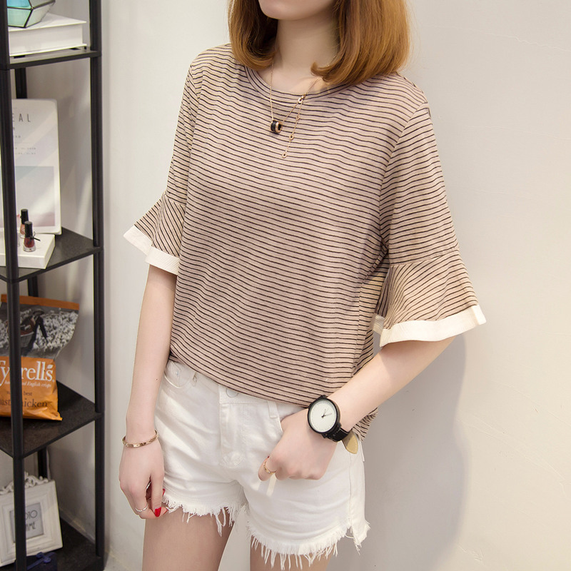 / 短袖上衣女夏新款條紋t恤女夏裝中長荷葉袖韓版寬松體恤百搭