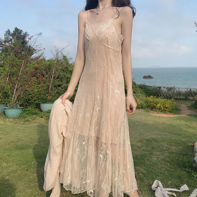 / 套裝女夏季新款韓版女裝中長款蕾絲吊帶連衣裙+薄款防曬針織開衫