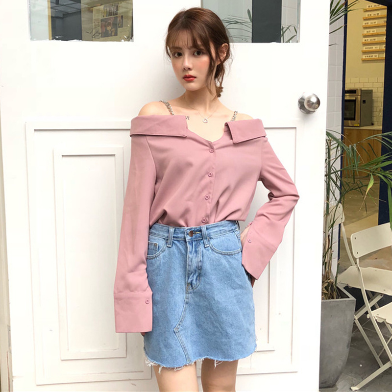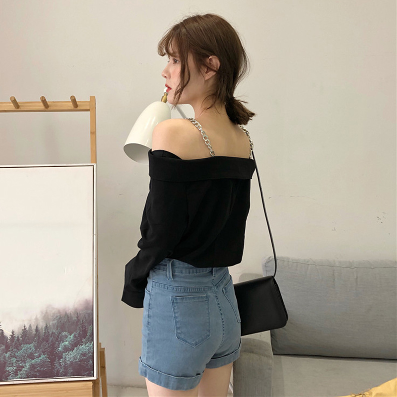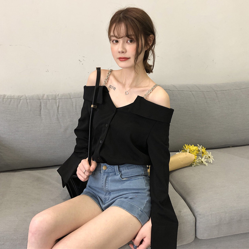 / 秋裝女新款時尚氣質心機一字露肩襯衫黑色鏈條吊帶開叉長袖上衣潮