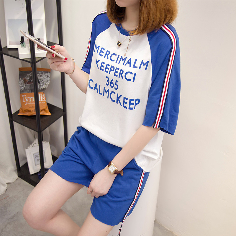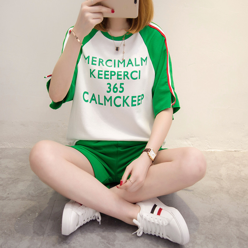 / 短袖上衣女夏新款字母拼色t恤女休閑兩件套韓版寬松百搭套裝