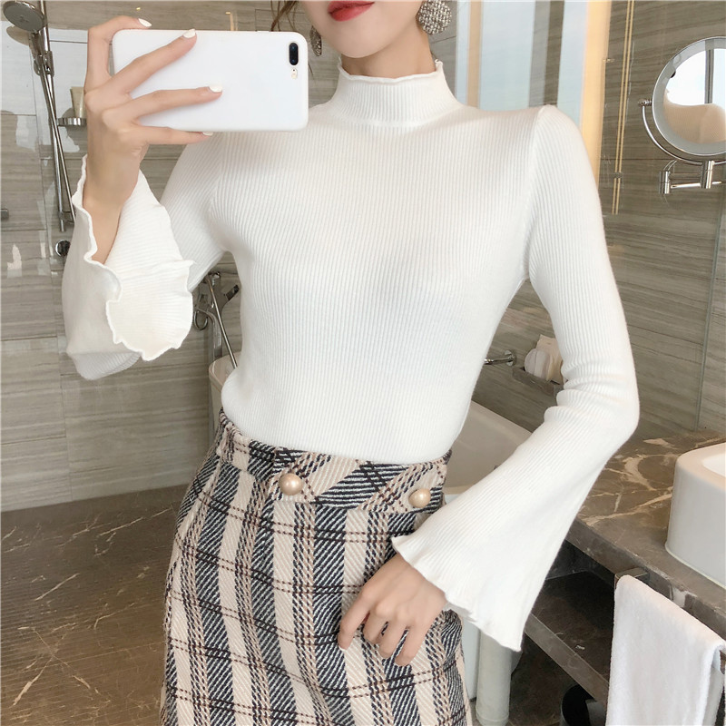 早秋2018新款女裝復古氣質半高領針織上衣修身顯瘦喇叭長袖打底衫