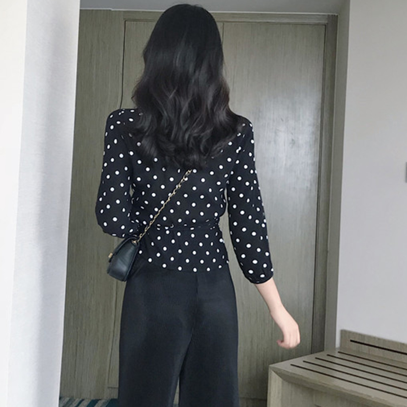 / 襯衣女夏季新款韓版女裝交叉v領七分袖波點襯衫系帶修身顯瘦上衣