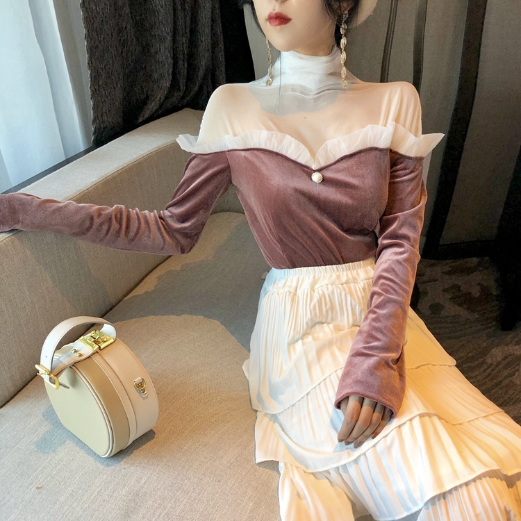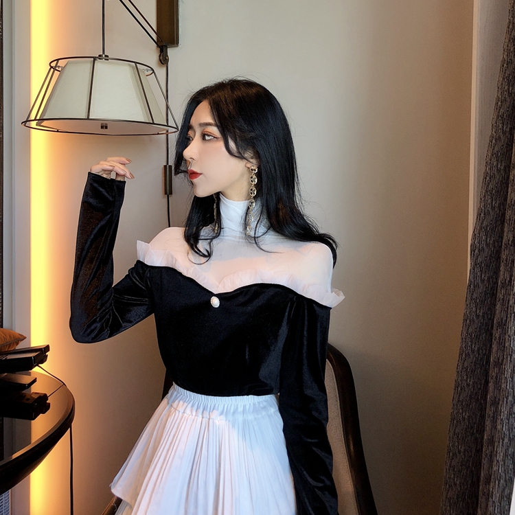 / 洋氣時尚新款韓版網紗堆堆領秋冬上衣氣質拼接木耳邊長袖打底衫女