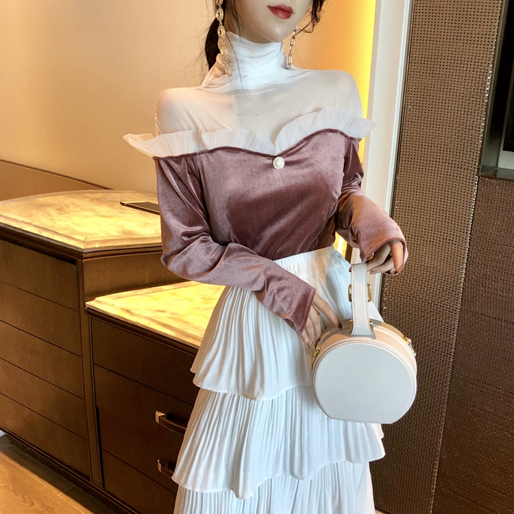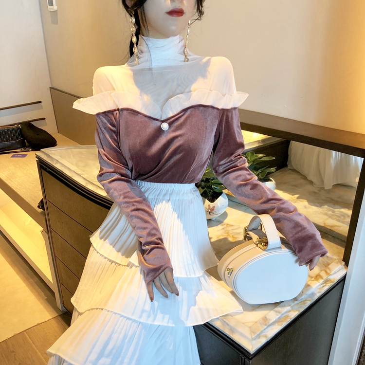 洋氣時尚新款韓版網紗堆堆領秋冬上衣氣質拼接木耳邊長袖打底衫女