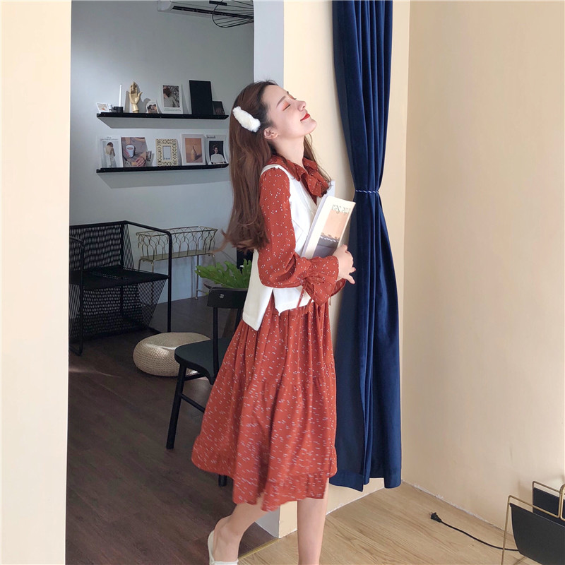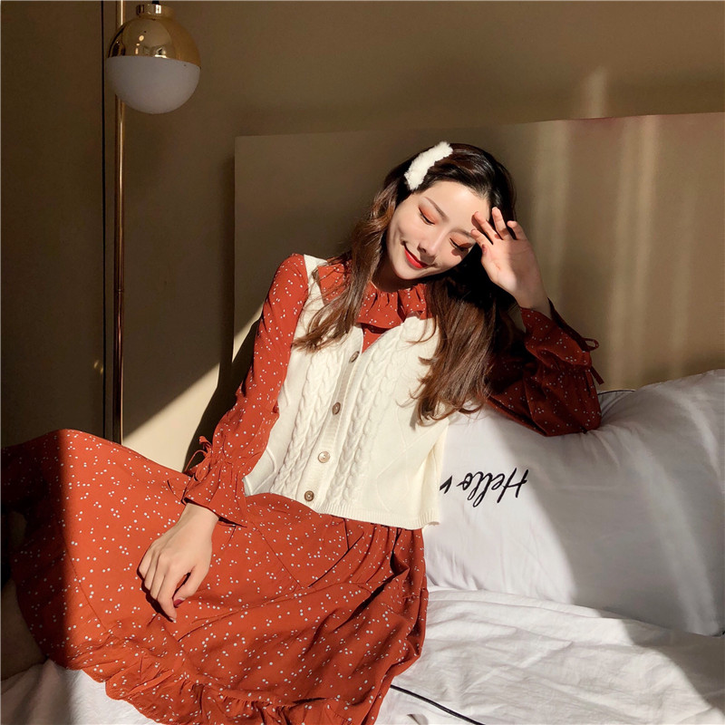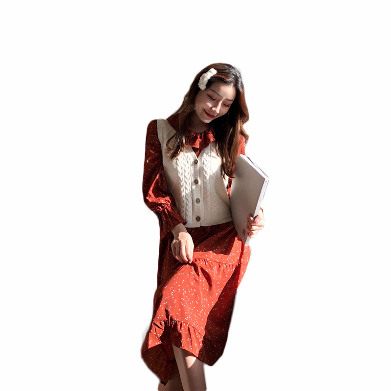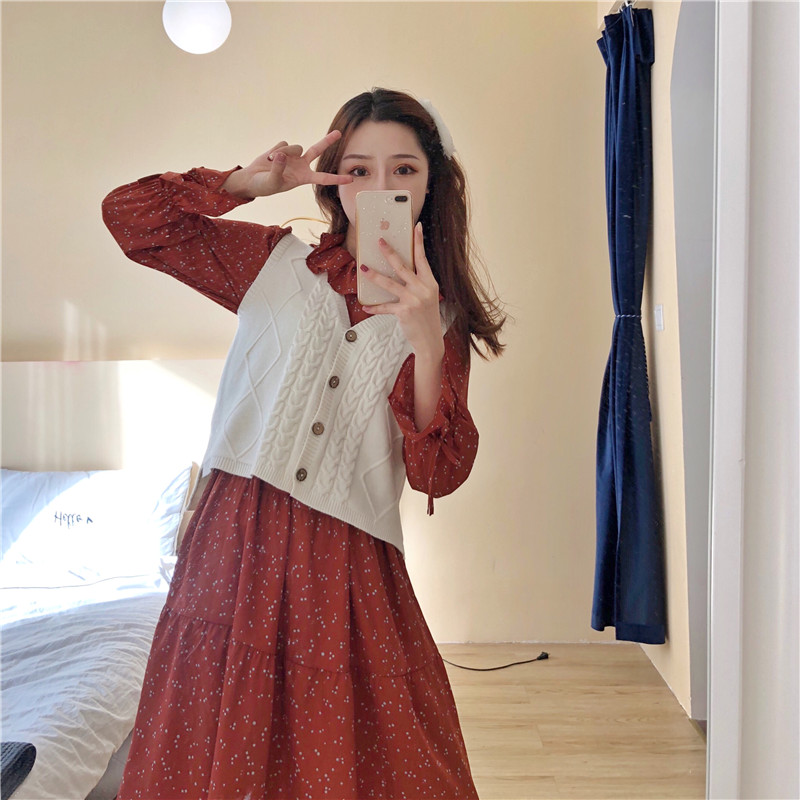 韓國鬼馬少女系甜美木耳邊收腰大擺裙+森系麻花毛衣馬甲時尚套裝