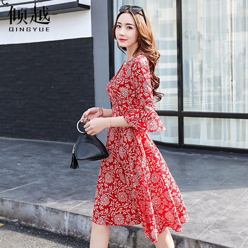 傾越雪紡碎花連衣裙夏季性感V領修身沙灘裙女中長款民族風喇叭袖