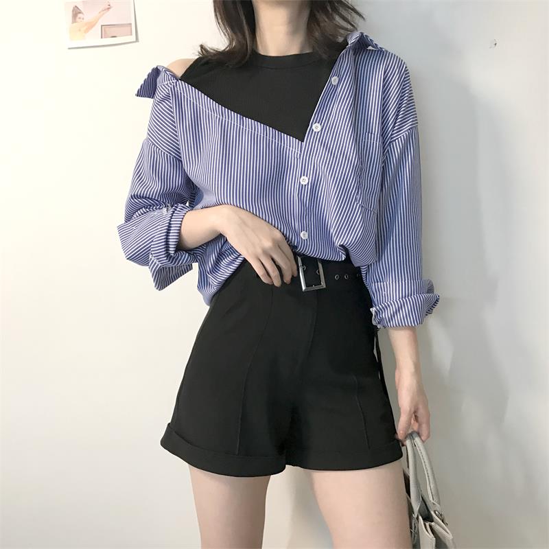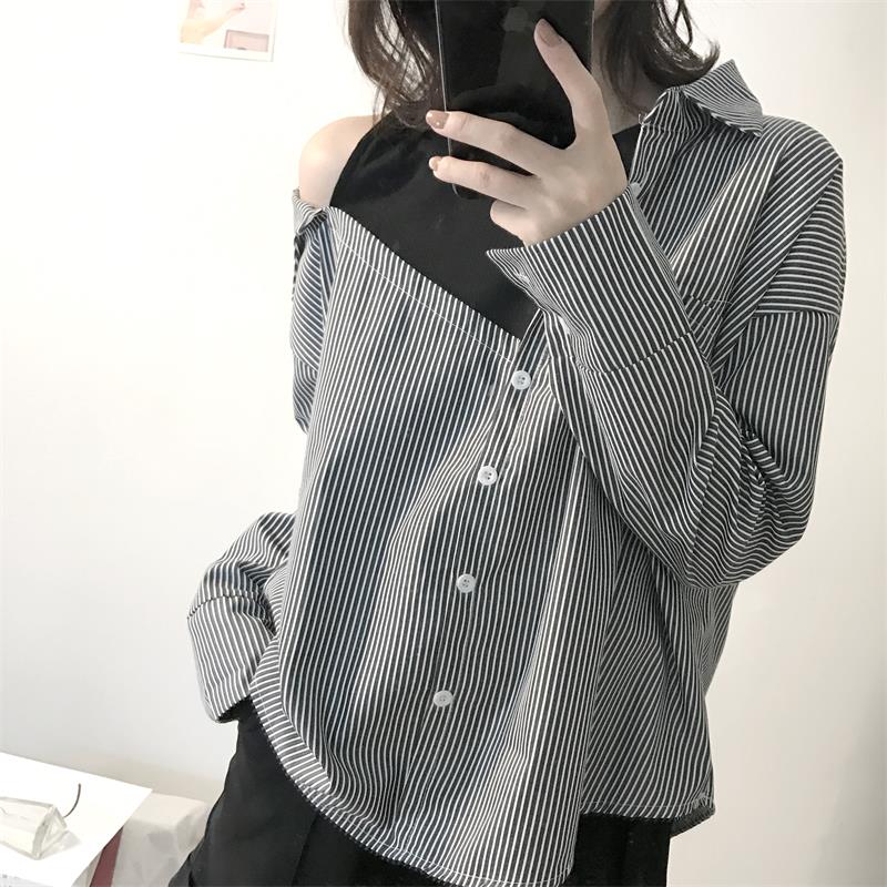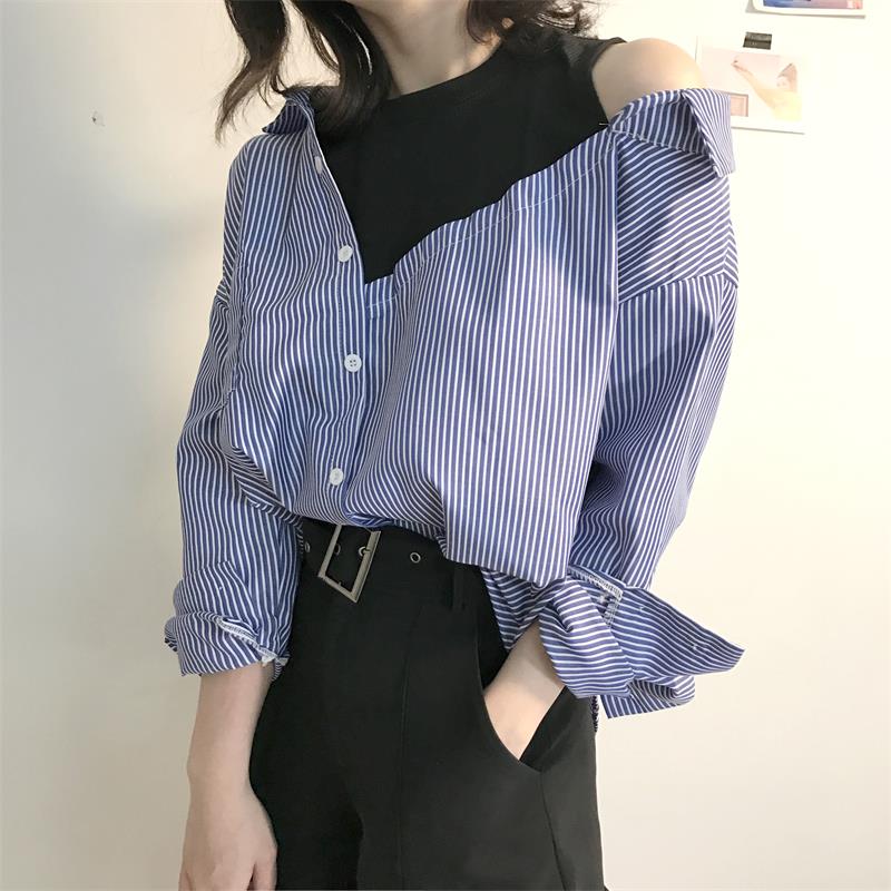 夏季新款女裝寬松顯瘦條紋小心機露肩假兩件拼接學生長袖襯衫上衣